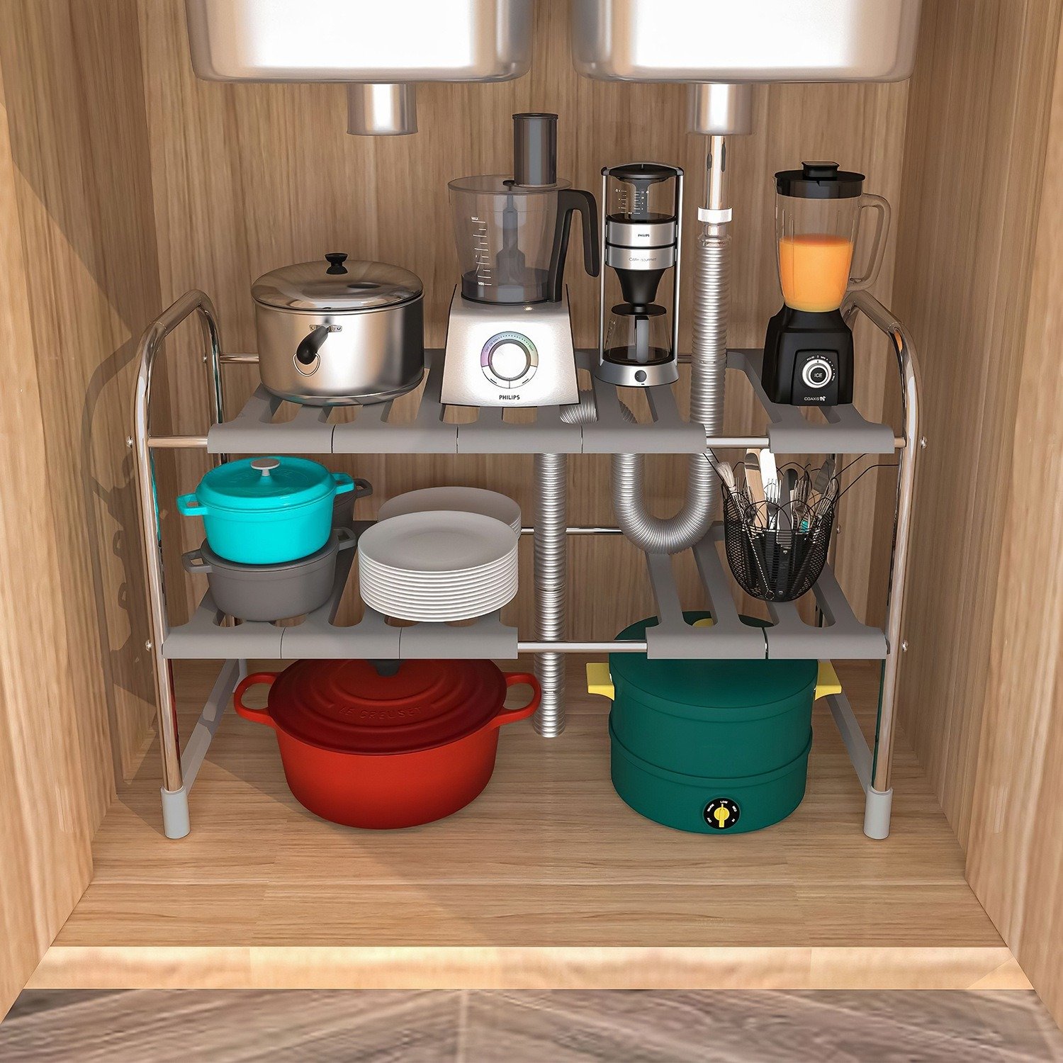 Home > 2 Tier Under Sink Organizer Retractable Kitchenware Rack Holders Space Saving Storage Shelf 55LBS Max Load