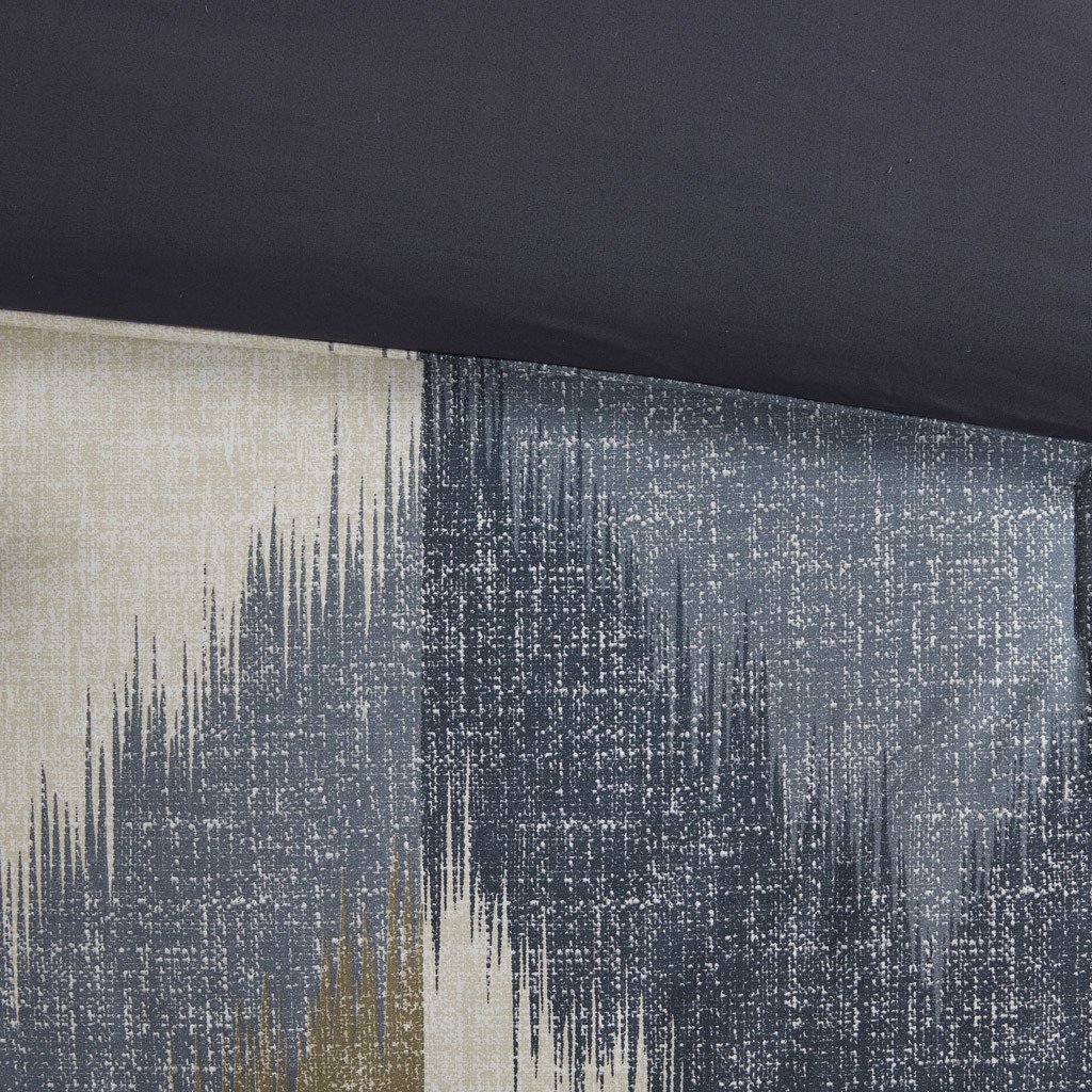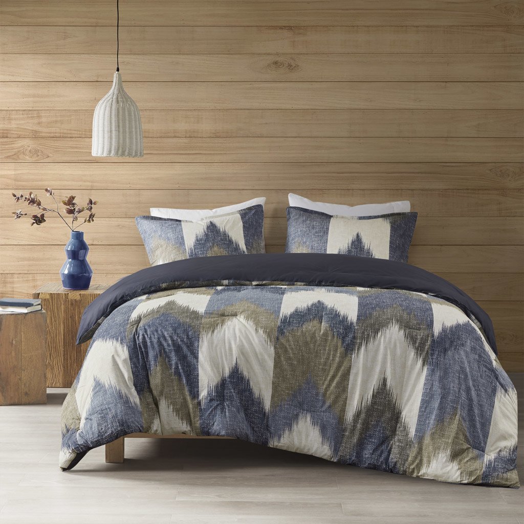 DescriptionElevate the beauty and style of your bedroom with the INK+IVY Alpine Comforter Mini Set. This cotton comforter set flaunts a sophisticated ikat chevron print on the face with a solid reverse to create a striking modern and elegant look. The 2 matching shams coordinate with the design of the cotton comforter to complete this dynamic bedding set. This comforter set is OEKO-TEX certified, meaning it does not contain any harmful substances or chemicals, and uses an antimicrobial treatment that provides built-in freshness protection, reducing the growth of odor causing bacteria to keep fabric lasting longer. Euro shams and decorative pillows are sold separately.Product DetailsFull/Queen1 Comforter:88"W x 92"L2 Standard Shams:20"W x 26"L (2)MaterialComforter/Sham: 200TC cotton, printed, 200TC solid cotton reverse, 250gsm polyester filling