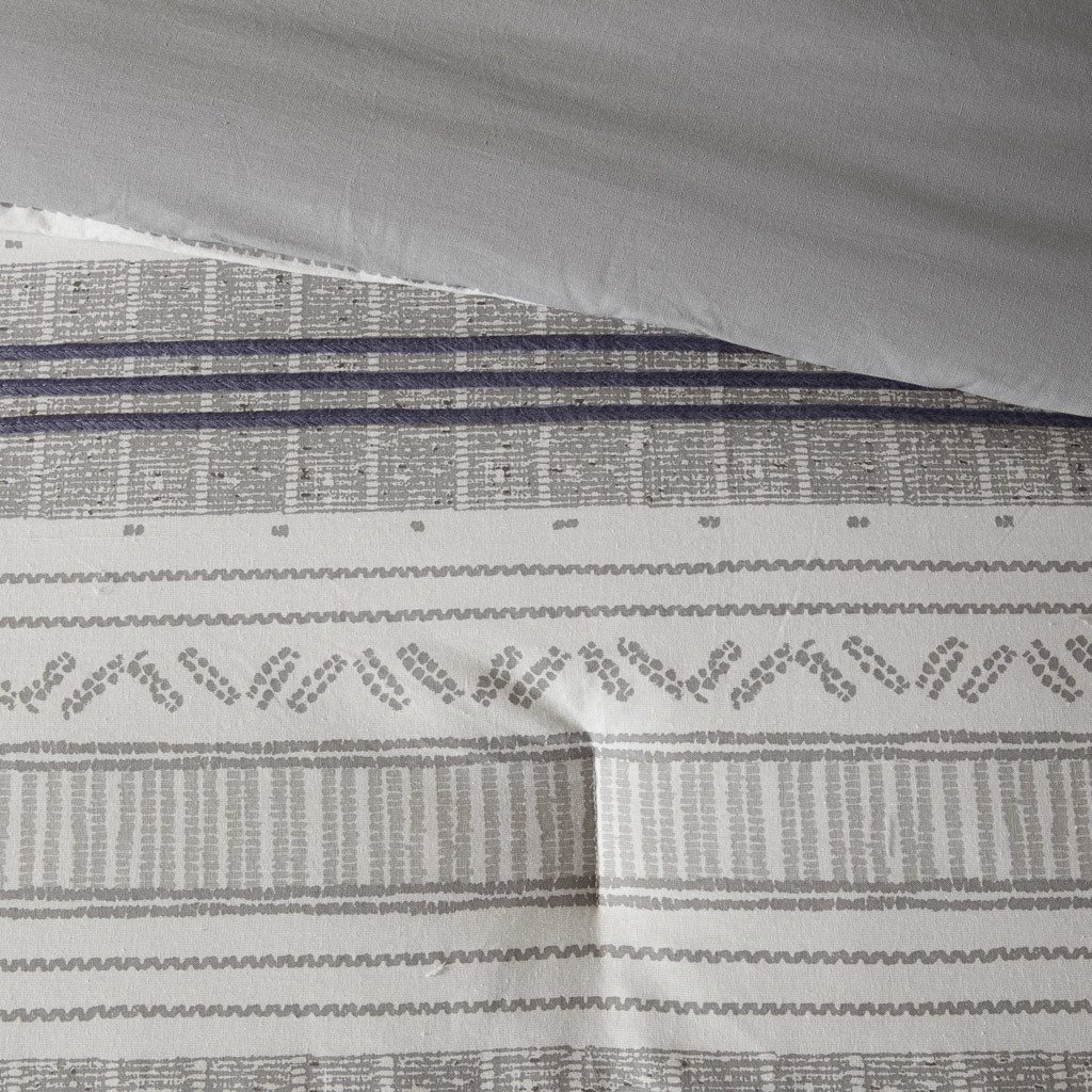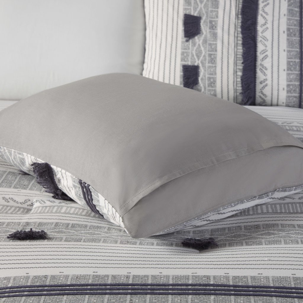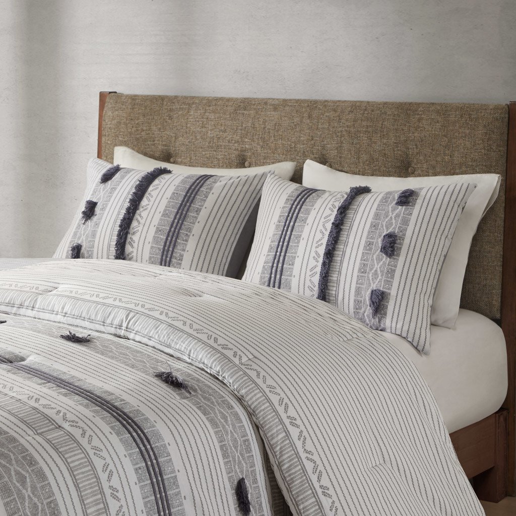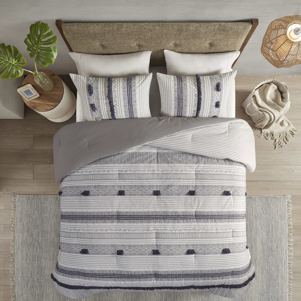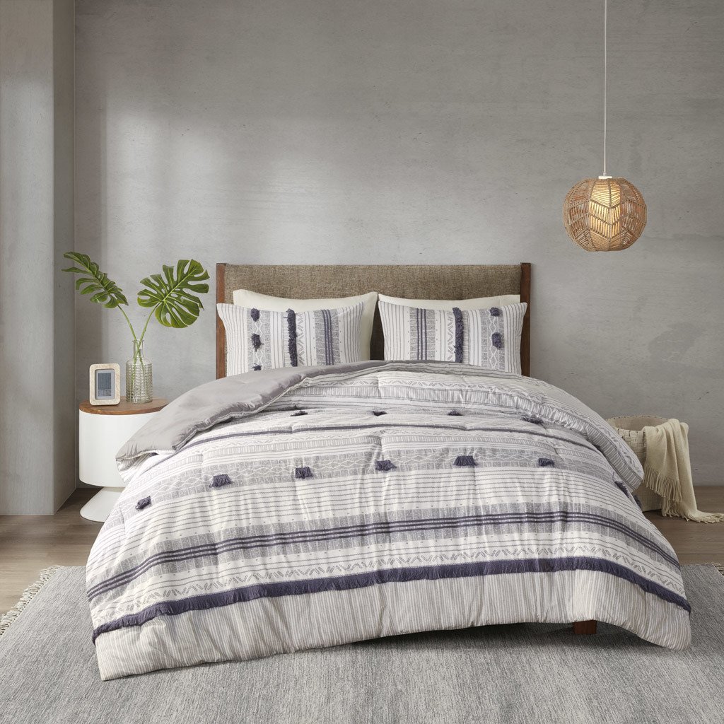 DescriptionThe INK+IVY Cody 3 Piece Cotton Comforter Set brings a smart combination of texture and style to your bedroom. This comforter features a grey and navy striped print on 100% cotton with pompom and trim details for a casual, yet sophisticated look, while the solid grey reverse complements the bold design. Matching shams with overlap openings, on the back, coordinate perfectly with the comforter to complete this casual bedding set. This comforter set is also OEKO-TEX certified, meaning it does not contain any harmful substances or chemicals to ensure quality comfort and wellness.Product DetailsFull/Queen1 Comforter:88"W x 92"L2 Standard Shams:20"W x 26"L (2)MaterialComforter/Sham: 100% cotton, printed, with pompoms and trims on top. Back: 100% cotton. Comforter Filling: 250gsm polyester