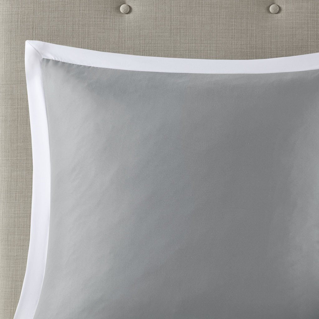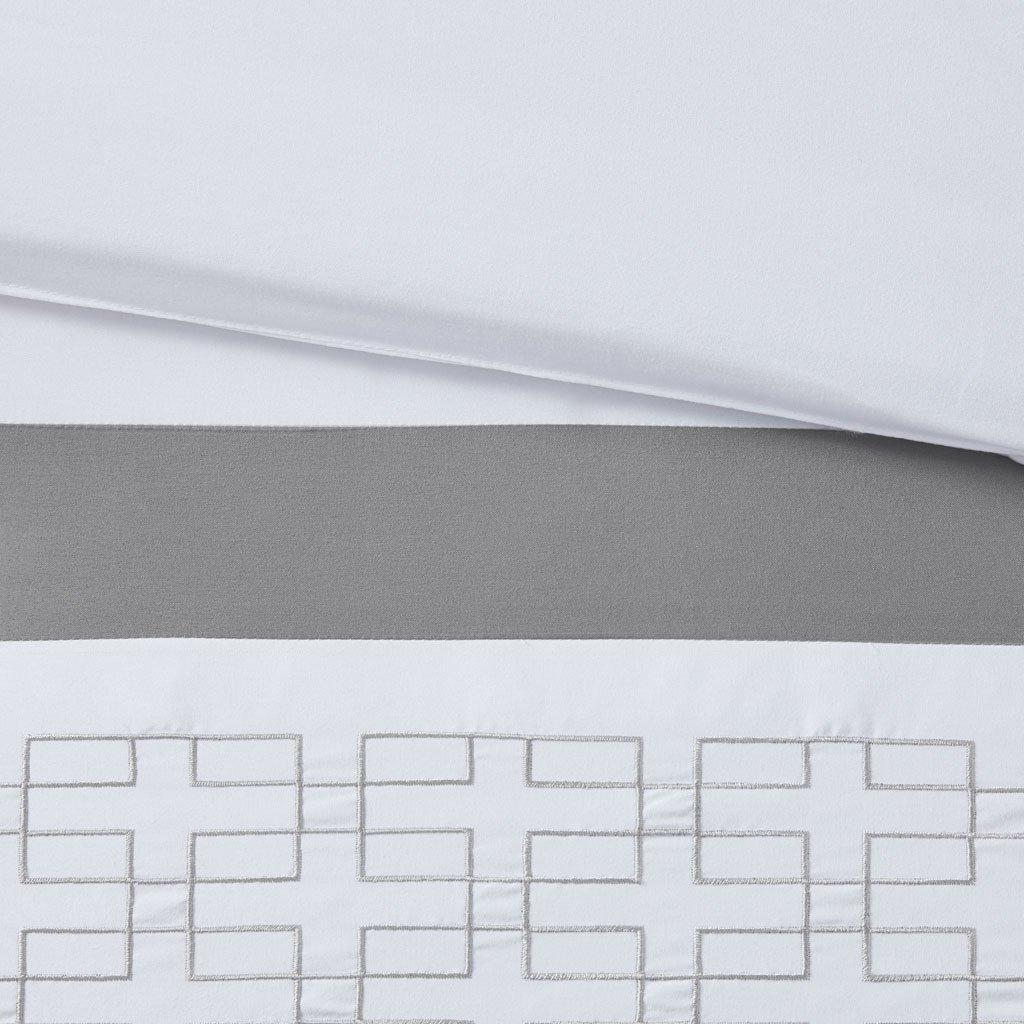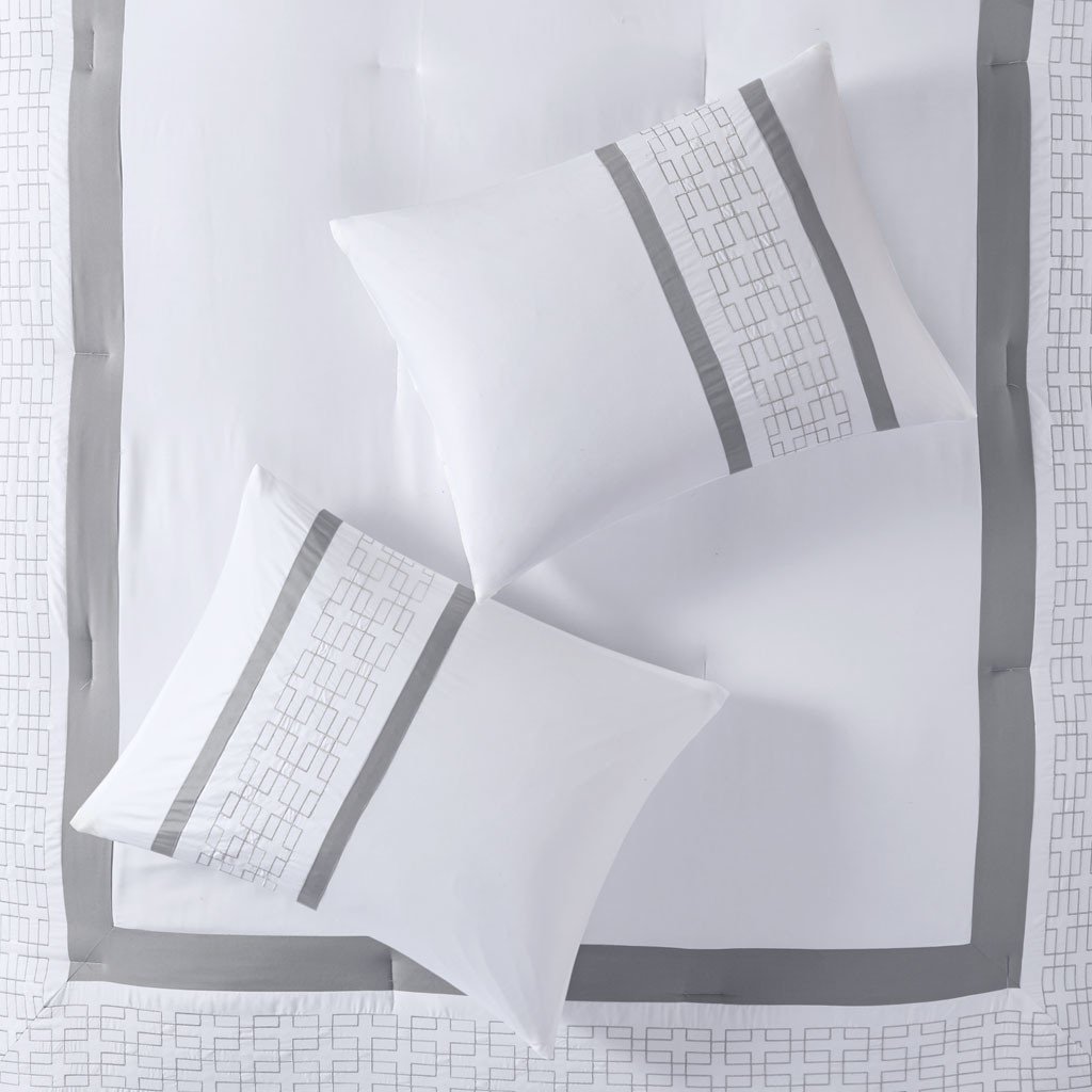 Transitional, hotel style 8 piece comforter set in white and grey with embroidered and pieced details