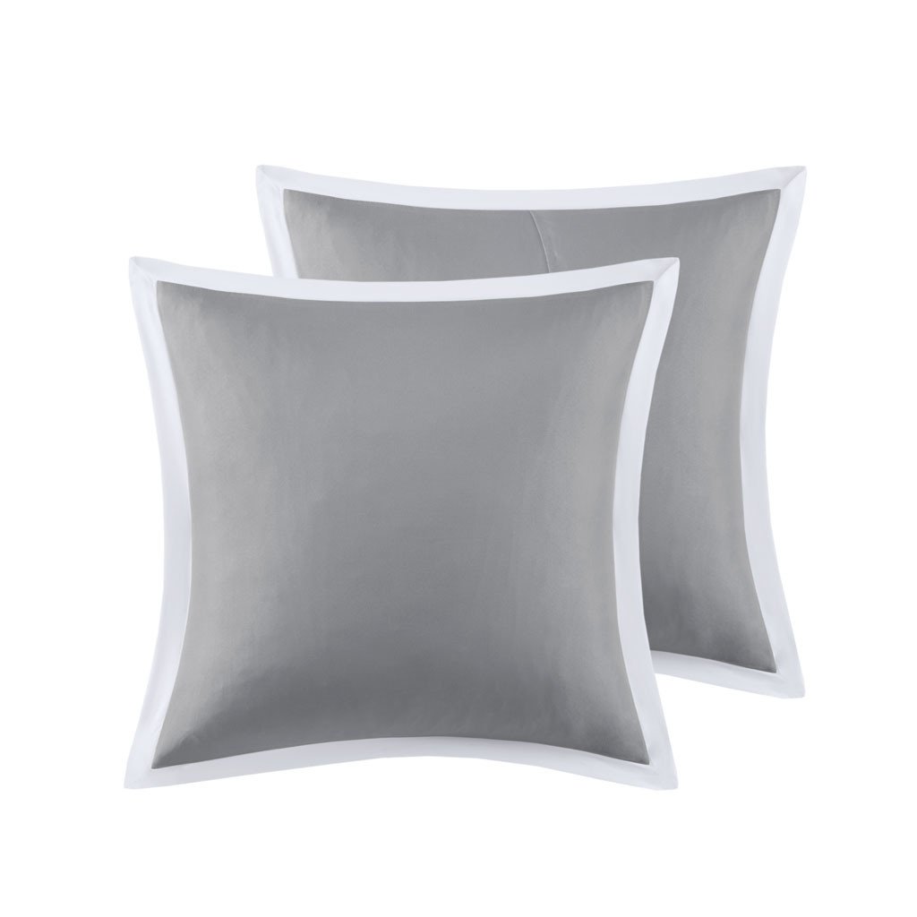 Description510 Design presents the Powell 8 Piece Embroidered Comforter Set to elevate your bedroom decor. This hotel style white comforter features an embroidered and pieced border for a sophisticated and elegant design that easily coordinates with your space. The matching pillow shams also flaunt beautiful embroidery details, while the grey Euro shams are accented with graceful white flanges to complete the transitional look. A solid grey bedskirt and 2 decorative pillows with embroidered details add the finishing touches to this hotel style bedding set. Hypoallergenic polyester filling in the comforter and pillows contains no allergens and is treated to be dustproof. Machine washable for easy care, this embroidered comforter set may come in rolled or compressed packing and will need to be fluffed up. Use a steam iron to help remove wrinkles easier.Product DetailsCal King1 Comforter:104"W x 92"L2 King Shams:20"W x 36"L (2)1 Bedskirt:72"W x 84"L+15"D1 Decorative Pillow:12"W x 16"L1 Decorative Pillow:18"W x 18"L2 Euro Shams:26"W x 26"L (2)MaterialComforter and shams: 100% polyester microfiber, pieced with embroidered face and microfiber reverse, 6 oz/sq yard polyester filling Bedskirt: 100% polyester microfiber drop, non-woven platformPillow: 100% polyester microfiber cover, 100% polyester filling, Euro sham: 100% polyester microfiber