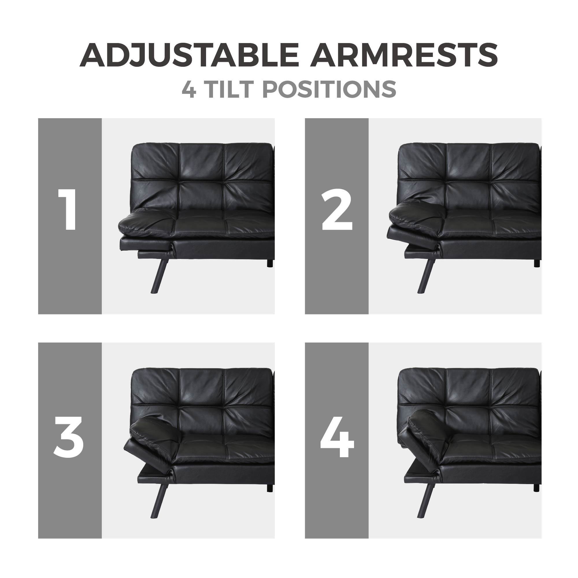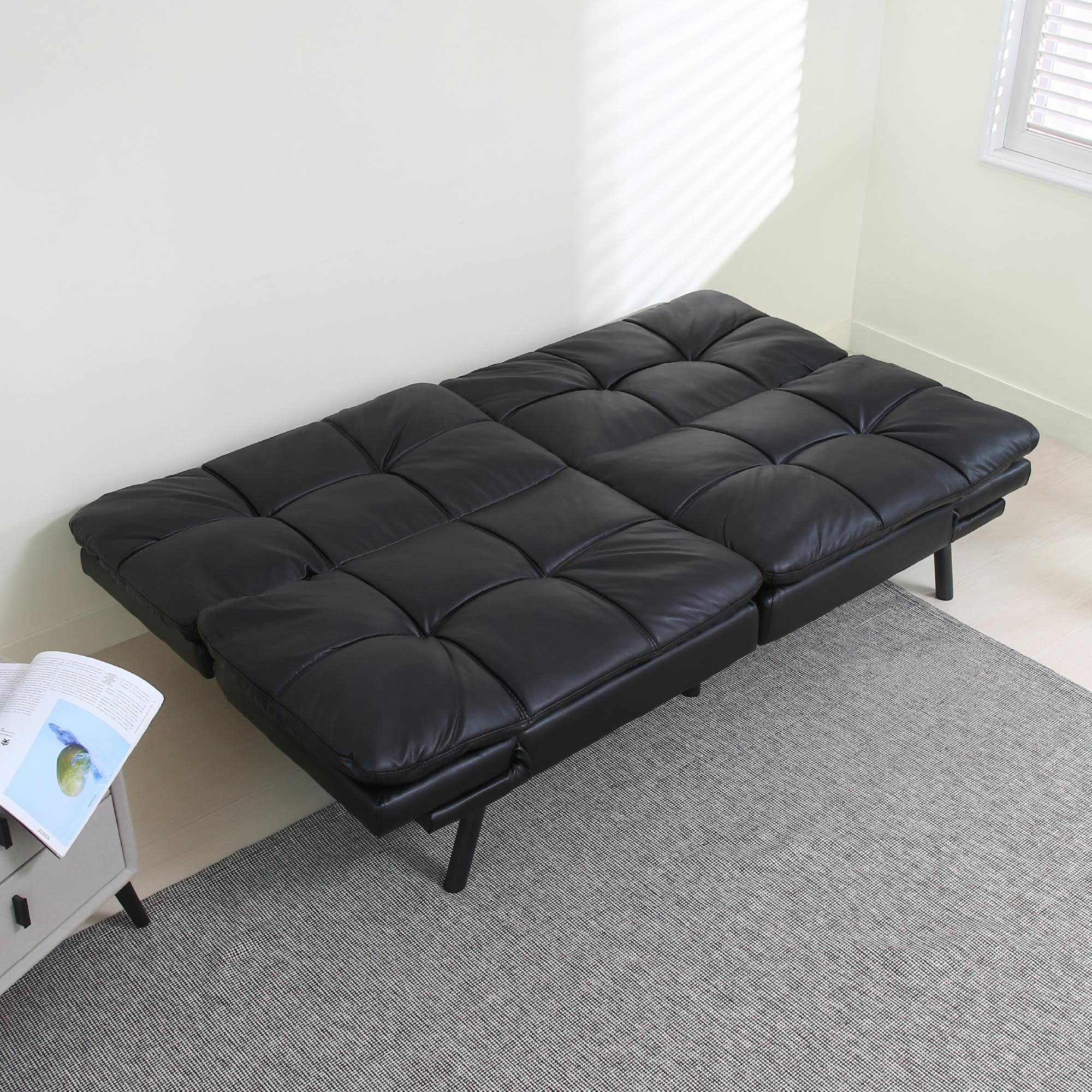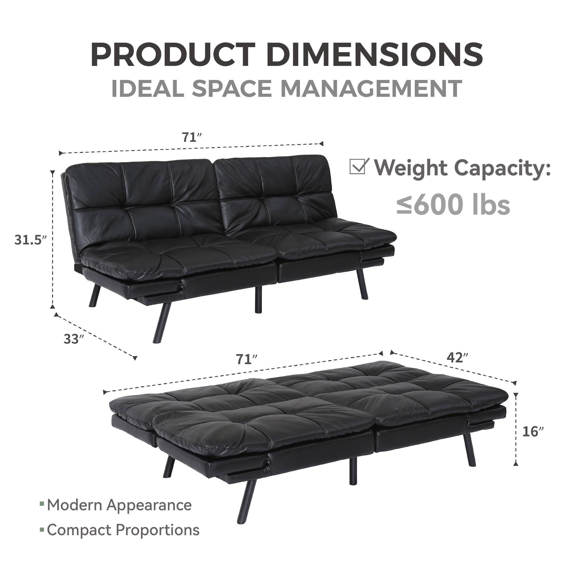 Feature[Covertible Futon Sofa Bed]One form of sofa can not satisfy everyone; we can convert the sofa into different forms by converting the armrests and backrests. Use it to watch TV or convert it into a bed for sleeping; which can not only help us save space; but also more economical.[Safety and comfort]In order to produce a soft and comfortable sofa; we increased the thickness of the memory foam inside the sofa to 3 inches; which means that when we convert the sofa into a bed; we don't need extra pillows or topper to get a deep sleep; the raw materials of the sofa are certified by CertiPUR-US without adding any harmful chemicals to protect you and your family's safety[Modern Loveseat]Modern design black PU sofa can decorate compact living space with high end atmosphere. If you accidentally spill coffee; drink; tea or other stains on the sofa; you can easily scrub it clean with just a damp cloth or paper towel[Sofa bed in a box]When we open the box to take out the sofa; we can follow the assembly video or instructions to easily complete the assembly; if you have any questions; our colleagues in the United States can easily help you solveProduct Dimensions