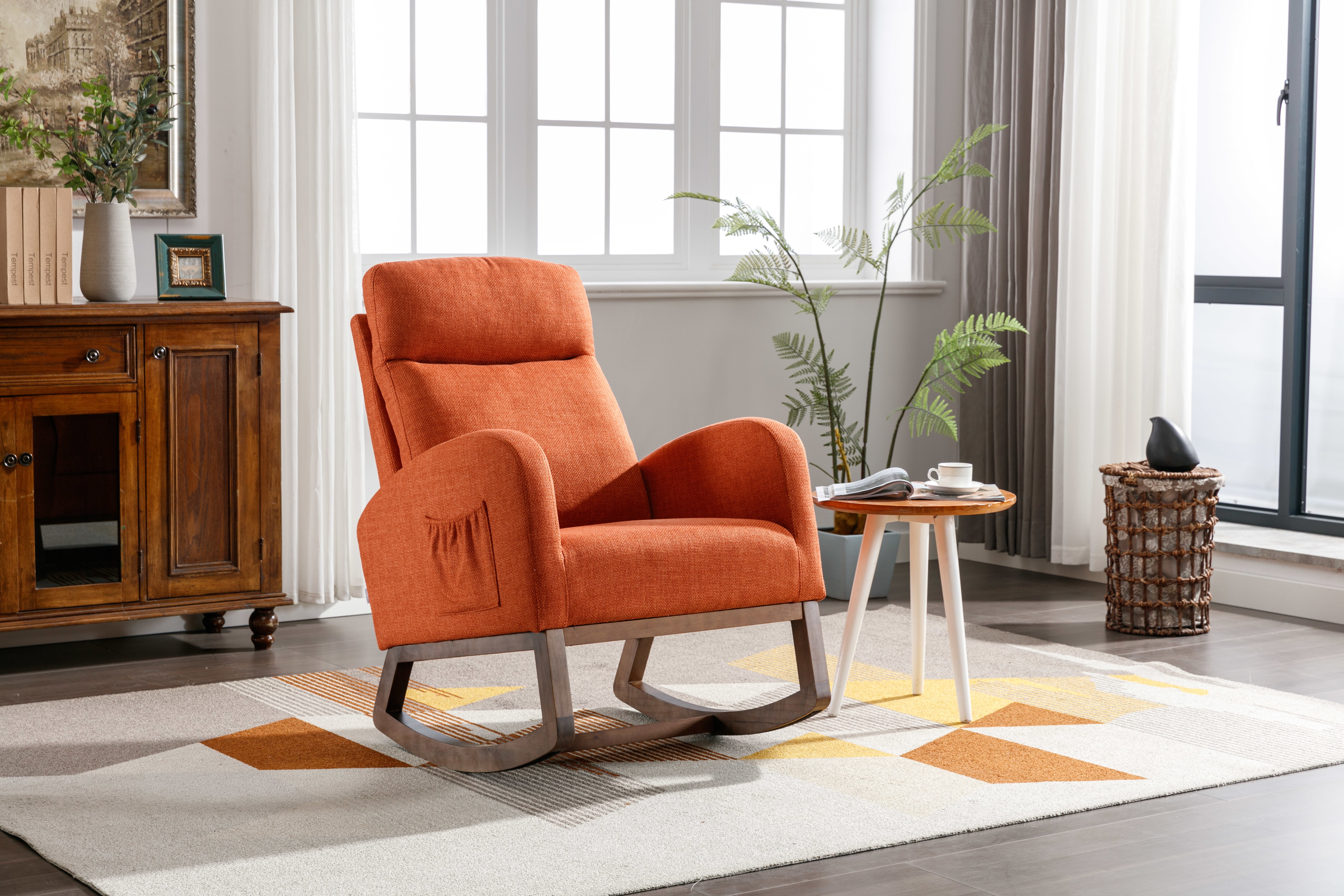 Mid-Century Modern Nursery Rocking Armchair Upholstered Tall Back Accent Glider RockerThe rocking chair provides a unique place to drink a cup of coffee, read a wonderful book, or comfortably pass the time. Durable and sturdy structure: The entire frame is made of solid wood, sturdy enough to support 300 pounds. Covered with high-quality fabric and filled with high-density soft sponge. High backrest and comfortable armrests: This ergonomic modern rocking chair provides strong support for your entire body. The high backrest provides you with great comfort and safety. More importantly, placing your hands or arms on comfortable armrests will reduce fatigue. Modern design: This rocking chair feels at home in the nursery, living room or any Shared space. The high back contour design and ergonomic arm height add more charm to this piece. Easy installation: Our rocking chair is easy to assemble. It can be assembled within 10 minutes. Including all hardware and components.Back and sidesMade of high-quality rattan fabric, the rocking chair is not only durable but also comfortable. The pocket design allows you to conveniently store small items like your phone or remote control while relaxing. The soft cushion provides excellent support and comfort, making it perfect for long periods of sitting. The ergonomic design of the backrest and the integrated pillow ensure that you can lean back and relax with ease. Versatile and adaptable, this rocking chair is suitable for various scene