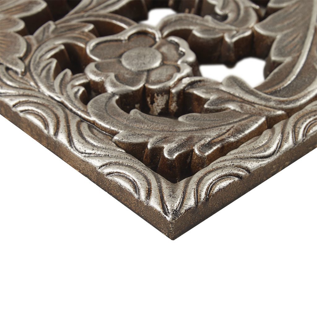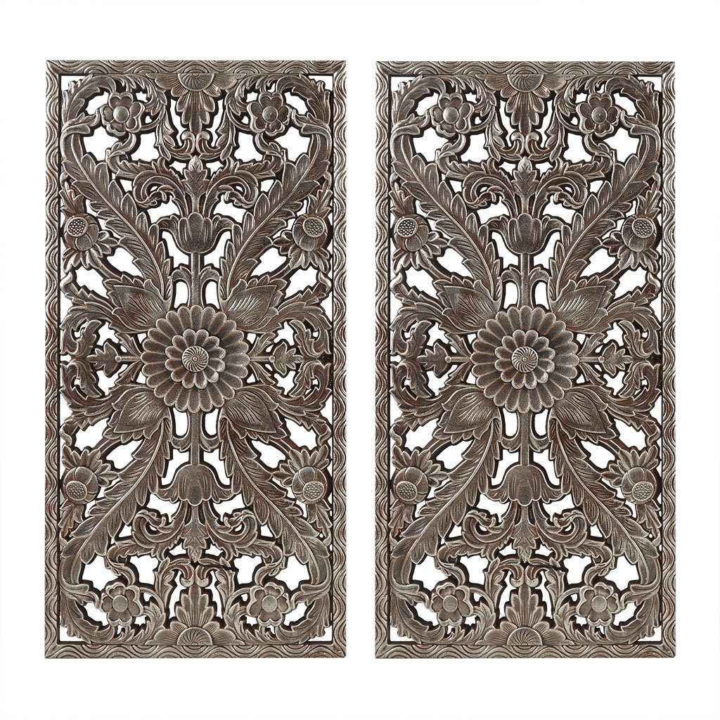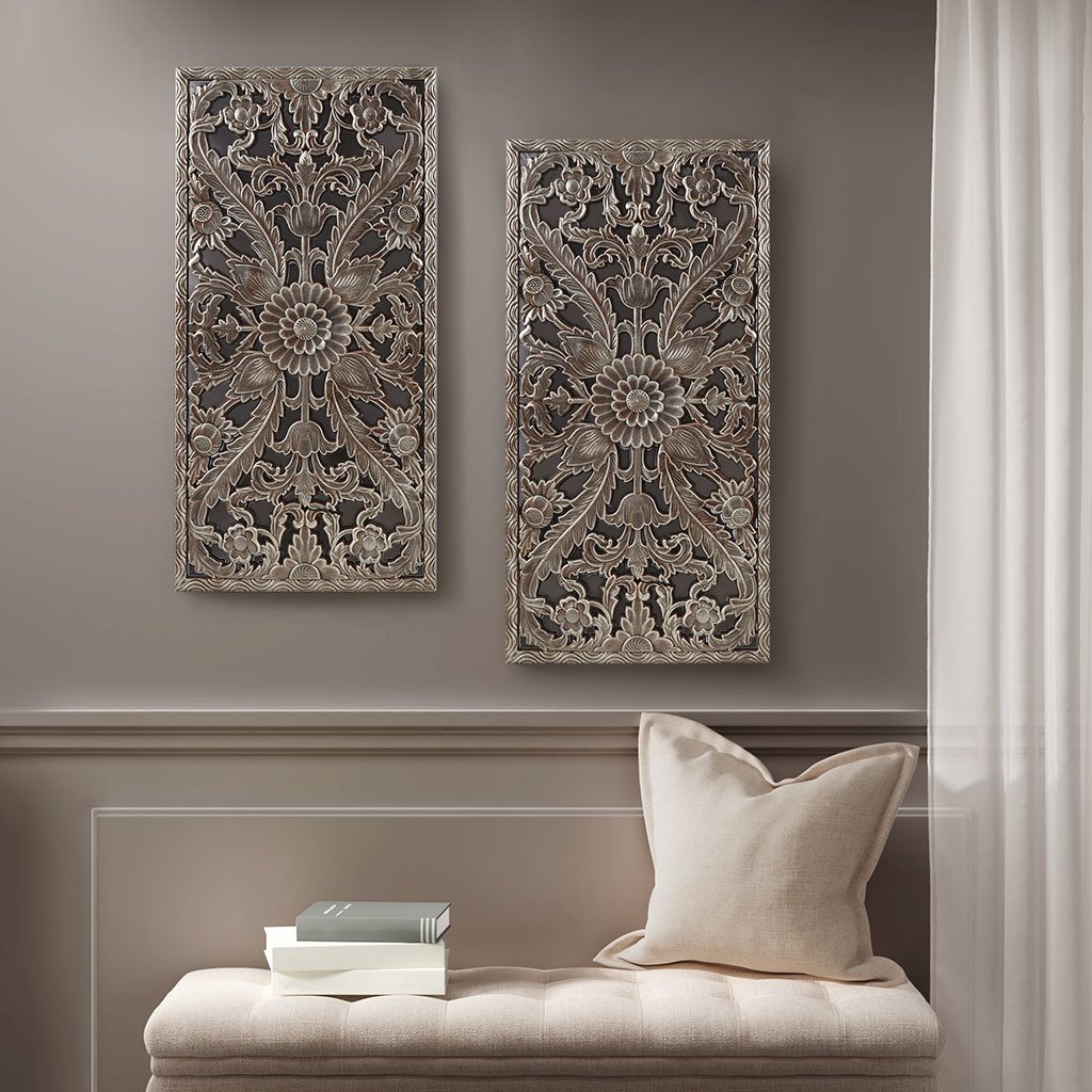 DESCRIPTIONComplete your home decor with our Madison Park Botanical Panel Distressed Carved Wood 2-piece Wall Decor Set. This wall decor set features exquisite carved global botanical designs in a durable MDF material creating beautiful texture and dimension, while an antique silver and bronze coat finish adds a unique color and luster. Each piece is finished with two D-rings on the reverse making it easy to hang pieces, either side by side for a more clean look or staggered for a more stylized approach. Perfect for any Living Room, Dining Room, or Entry way - this carved wood panel 2 piece set is the perfect elegant touch to any decor.PRODUCT DETAILSSee below2 Wall Panels: 15.75"W x 31.5"H x 0.59"D (2)MATERIALMDF: 100%