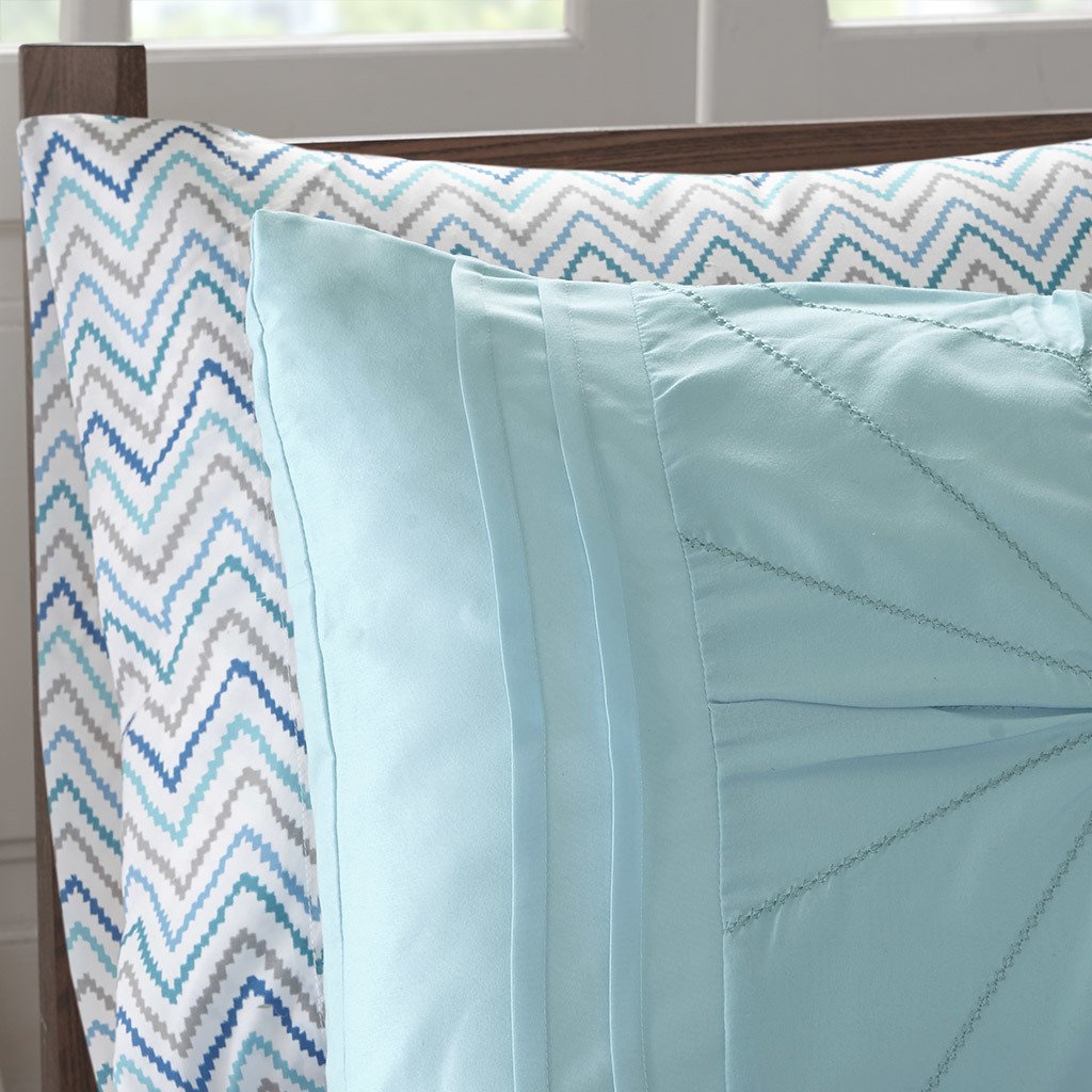 DescriptionThe Intelligent Design Toren Embroidered Comforter Set with Bed Sheets flaunts a simple elegance to elevate your bedroom. Embroidered pleating and stitching details adorn the top of the soft aqua comforter, adding texture and dimension to the top of the bed. Stylish shams (1 in Twin/TwinXL) display a similar pleated design and embroidered detailing seen on the comforter creating a fully coordinated look. A colorful chevron print sheet set and gorgeous decorative pillow adds a fun splash of color and style. The solid bed skirt provides a crisp and clean finishing touch to the comforter set. This bedding set is also OEKO-TEX certified, meaning it does not contain any harmful substances or chemicals to ensure quality comfort and wellness.Product DetailsTwin1 Comforter:68''W x 86''L1 Standard Sham:20''W x 26''L + 2''D1 Bedskirt:39''W x 75''L + 14''D1 Decorative Pillow:12''W x 16"L1 Flat Sheet:66''W x 96''L1 Fitted Sheet:39''W x 75''L + 12"D1 Pillowcase:20''W x 30"LMaterialsoft brushed solid microfiber with emb and tufting panel, 5oz/sq yard polyester filling; Soft brushed printed microfiber flat sheet and fitted sheet; embroidered decorative pillow