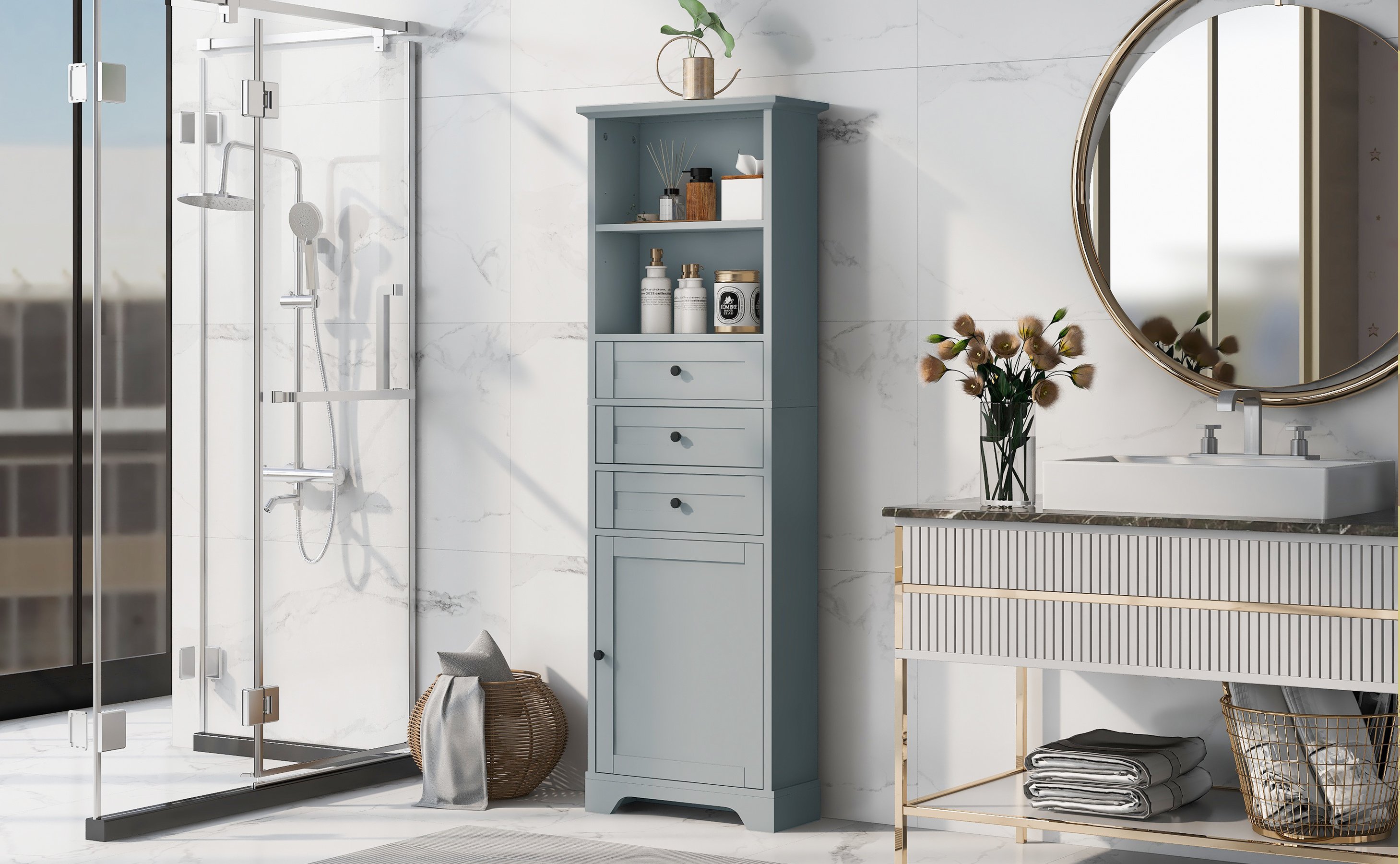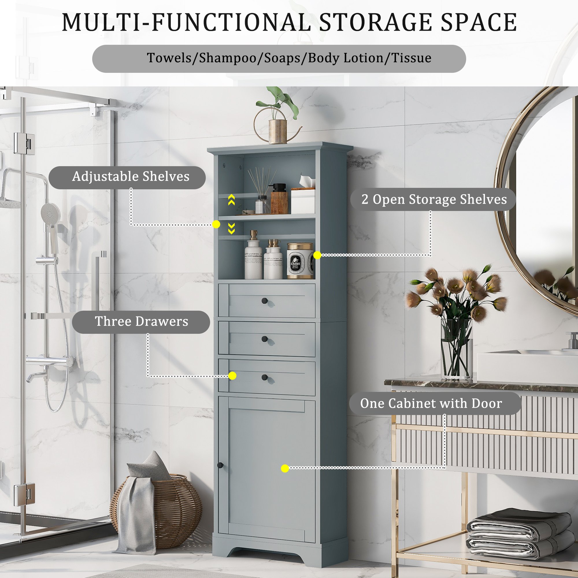 Grey Tall Storage Cabinet with 3 Drawers and Adjustable Shelves for Bathroom, Kitchen and Living Room, MDF Board with Painted Finish