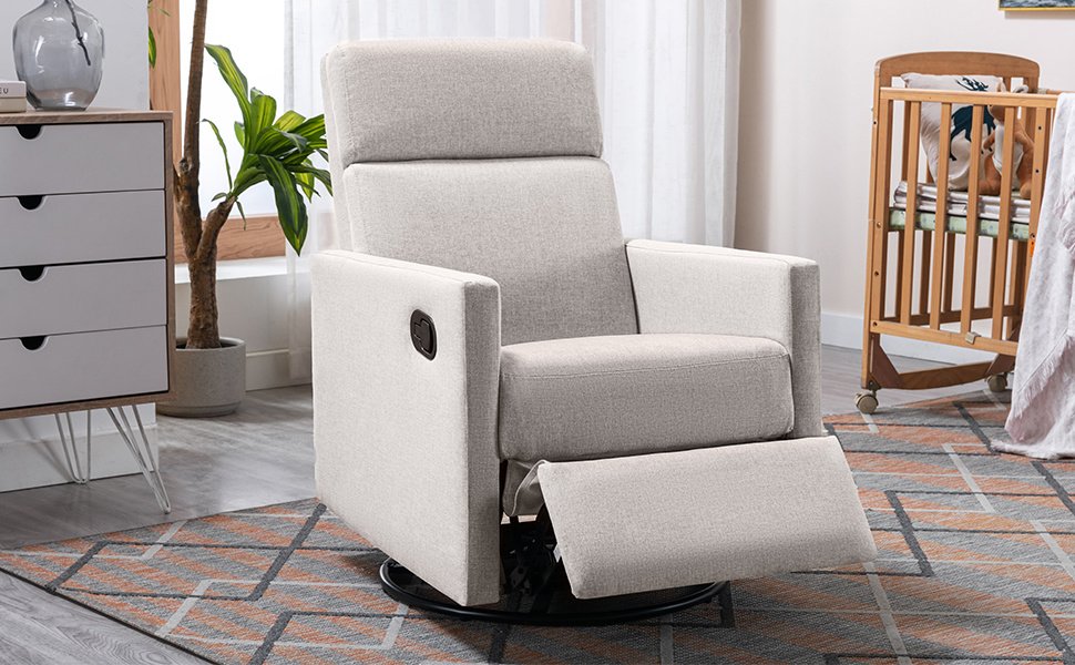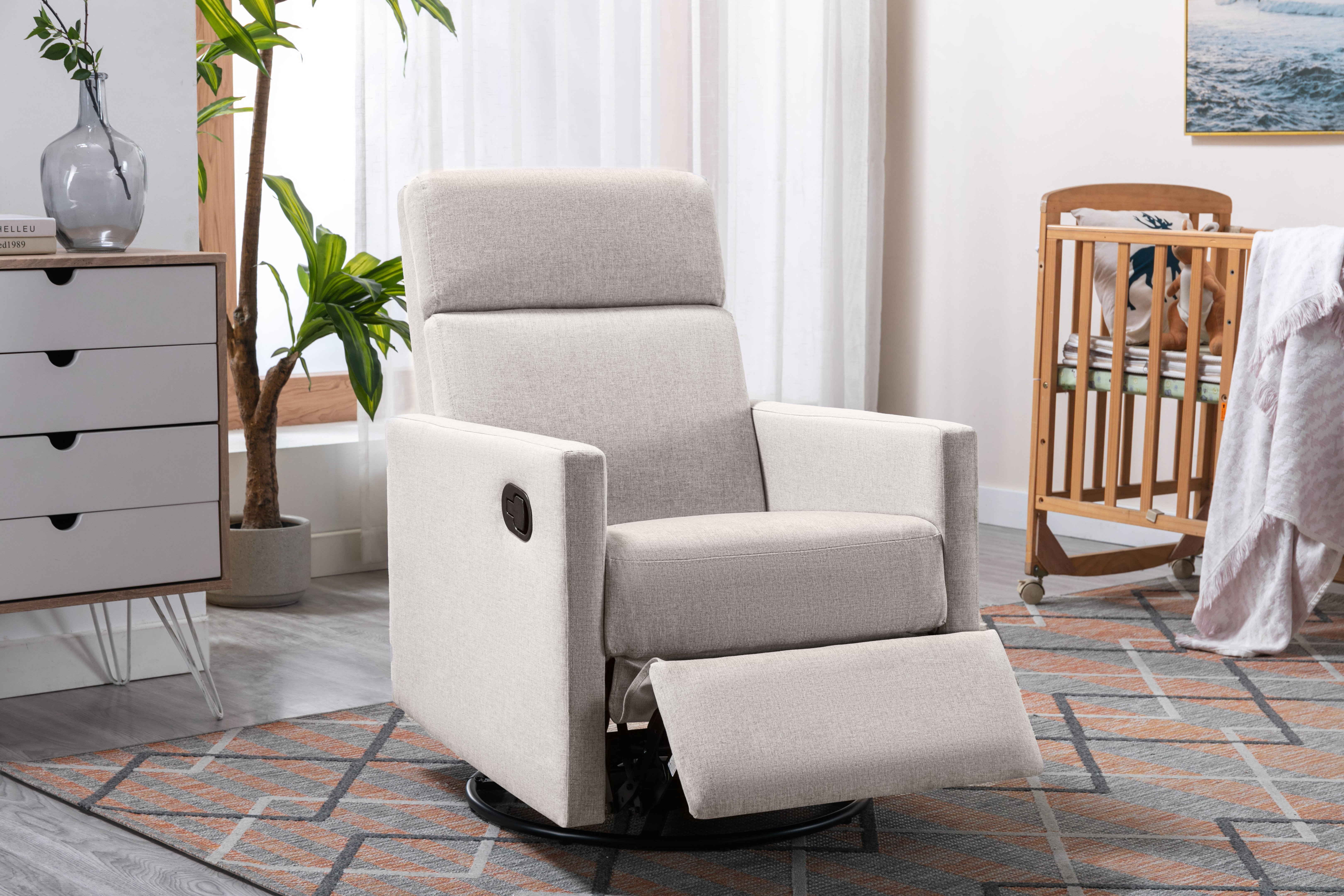 Relax and recline after a long day in this sleek power recliner. It's built on a Swivel Glider Nursery Chair has been designed for mamas and papas with a high plush pillow back for head and neck support. The smooth gliding, 360-degree swivel base allows you to gently lull your babe to sleep. It's a stylish but also more sustainable choice for the modern nursery.Photo may be slightly different from the actual item in terms of color due to the monitor's display.