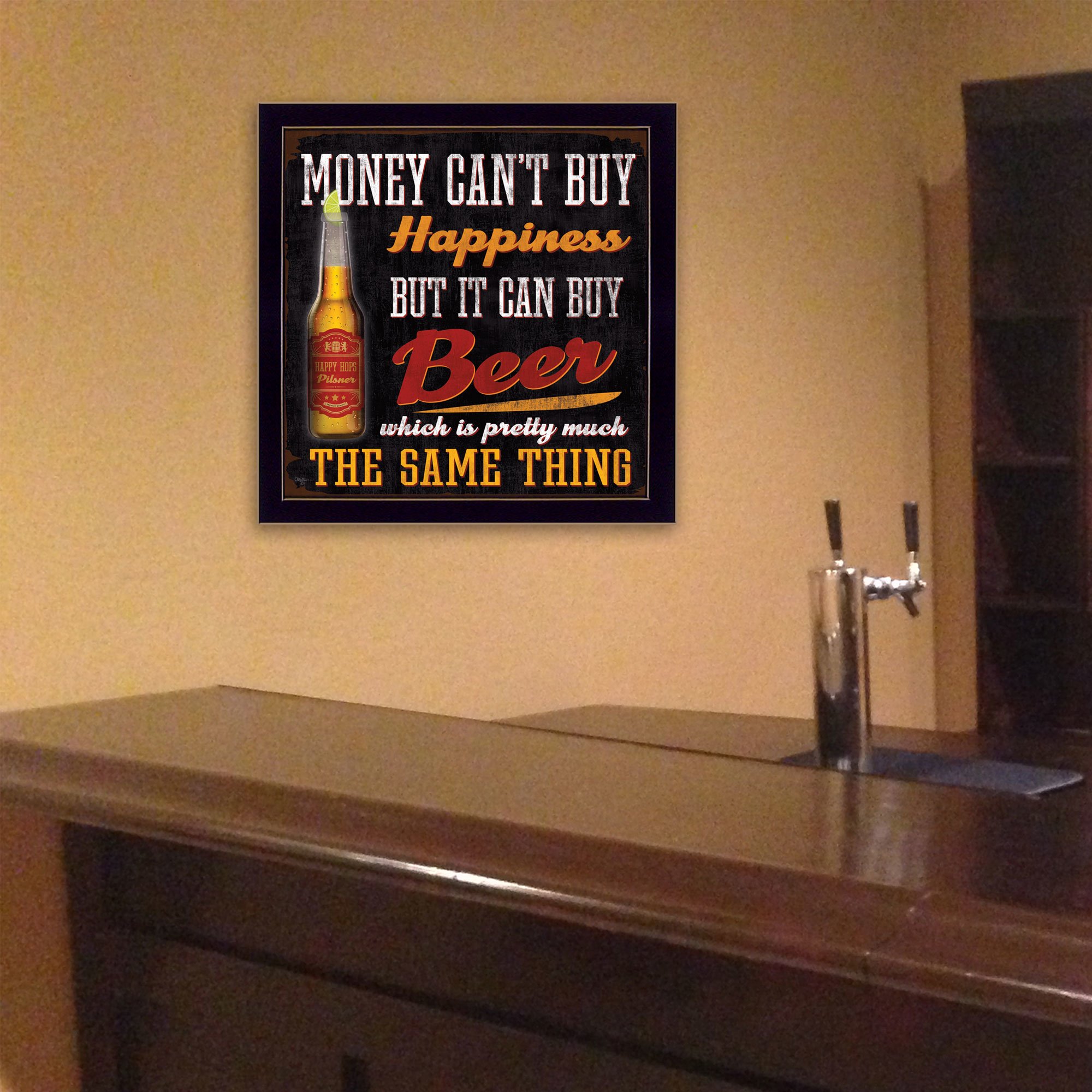 MOL1524-712, "Money Can't Buy Happiness", but it can buy beer! A 14"x14" framed art print by Mollie B. framed in a decorative black frame. This print will get the laughs in any man-cave. The print has a protective, archival finish (glass is not needed) and arrives ready to hang. Made in the USA with pride by skilled American workers.•Women Owned (WBE)•Textured Artwork with a 'rolled on' acid free acrylic coating to create a canvas painting effect. No glass is necessary.•UV protectant coating protects artwork from fading.•Arrives Ready to Hang