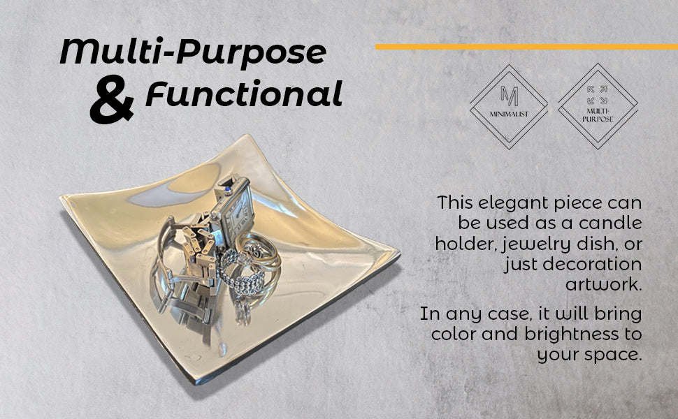 Choixe's astonishing square-shaped candle holder.MULTI-PURPOSE. This elegant piece can be used as a candle holder; jewelry dish; or just decoration artwork. In any case; it will bring color and brightness to your space.MINIMALIST DESIGN. Simplicity; clean lines; monochromatic accent; and contemporary styling make this handicraft an essential piece for modern decor.ECO-FRIENDLY.A sustainable product made of recycled aluminum that helps reduce energy usage during the making process while decreasing landfill waste.CRAFTSMANSHIP. Each piece is made at a time using expertly processed recycled aluminum alloy finished with multi-step polishing creating a piece of artwork with a balance of functionality and modern design.Dimensions: 4" x 4" x 1.2"Weight: 4.5oz.Directions: Wipe with a dry cloth. Hand-wash only.