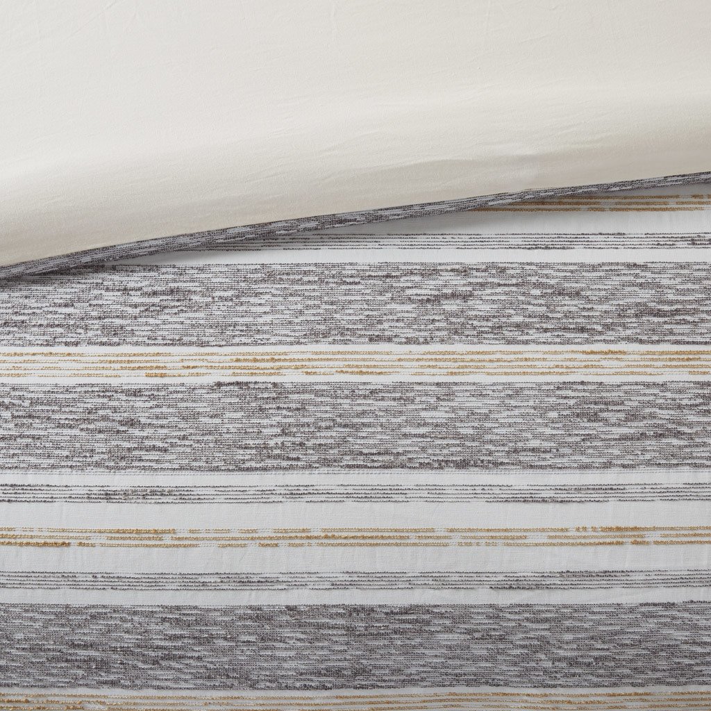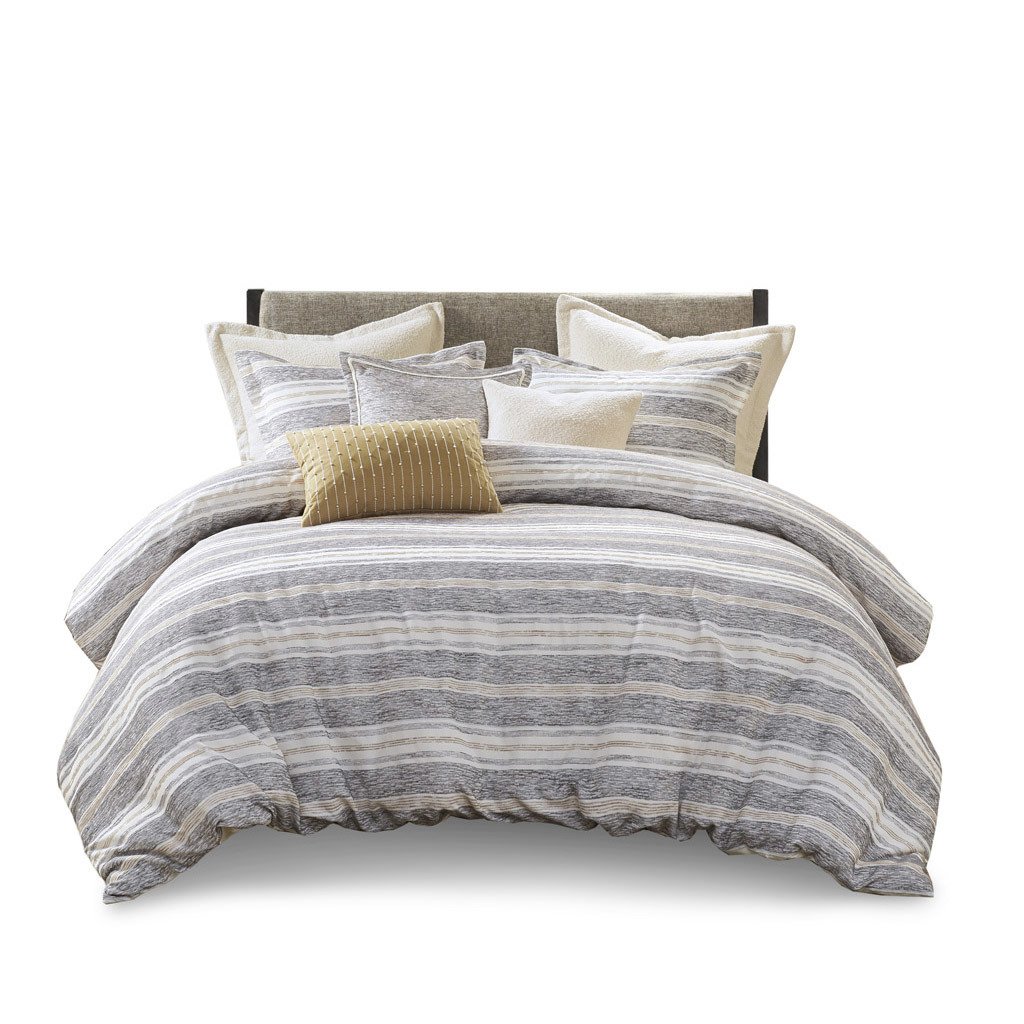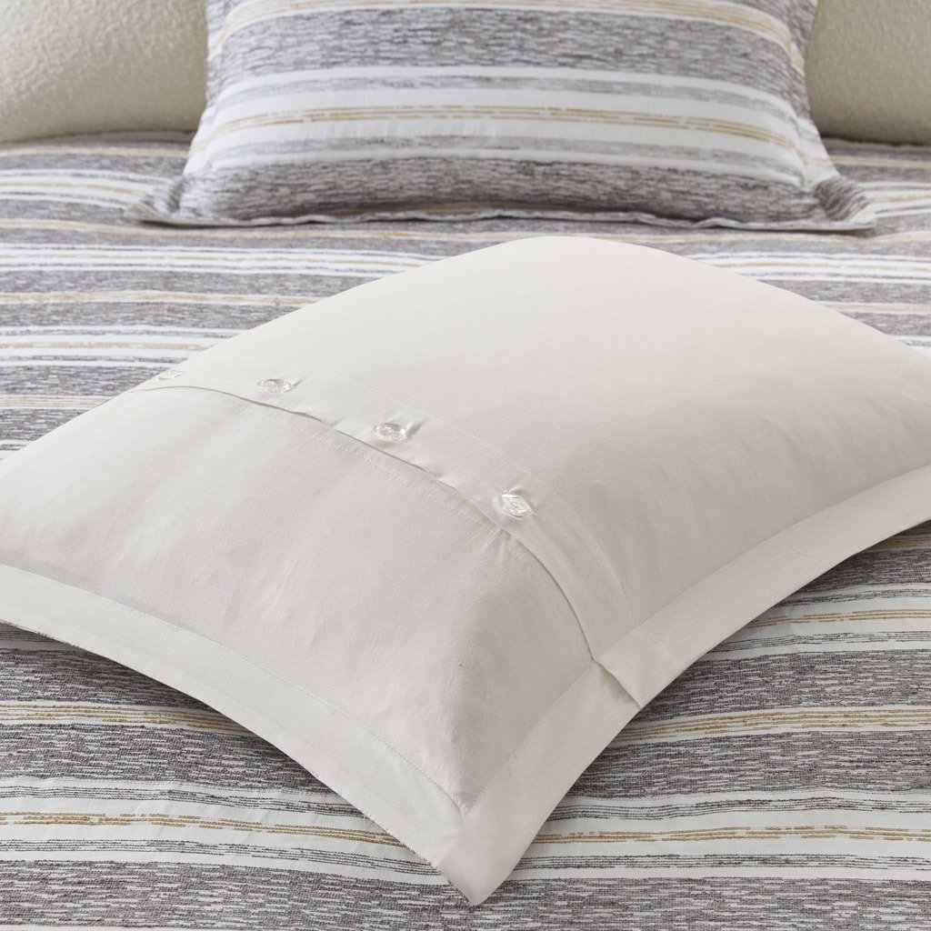DescriptionThe Madison Park Signature Oasis oversized duvet-style comforter features a chenille jacquard stripe design in charcoal, dark golden yellow, and ivory for a casual, textured look. The bedding set includes 2 matching shams and 2 boucle Euro shams (3 in King size) that coordinate beautifully with the comforter. Plus, 3 decorative pillows with unique piping and embroidered details add the finishing touches, and have removable covers with hidden zippers for easy cleaning. This comforter uses a removable overfilled insert that is secured by inner ties and a hidden button closure, which provides no visible bartacking lines on top of the bed to create a smooth, clean look. The hypoallergenic polyester filling in the removable insert contains no allergens and is treated to be dustproof so you can sleep comfortably. Dry clean comforter cover only and machine wash comforter filler.Product DetailsFull/Queen1 Comforter:92"W x 96"L2 Standard Shams:20"W x 26"L + 1.5"D (2)2 Euro Shams:26"W x 26"L + 1.5"D (2)1 Throw Pillow:20"W x 20"L1 Throw Pillow:18"W x 18"L1 Throw Pillow:14"W x 20"LMaterialComforter/Sham: 60% cotton, 40% polyester, jacquard Reverse: 100% cotton solid Filling: 100% polyester
