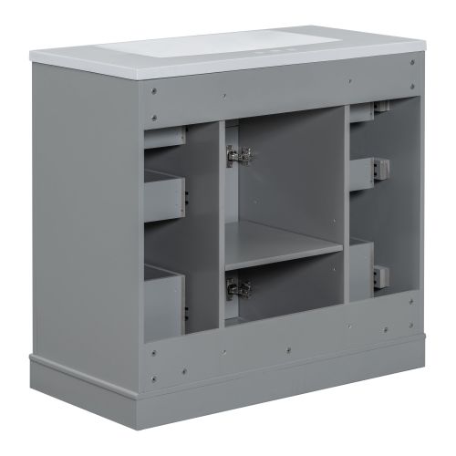 Vanity with Cabinet & Drawers & Shelf - Considering the humid environment in bathroom, this bathroom vanity has ample enclosed storage spaces: one cabinet with door, three drawers with slide rail each side (the top middle one drawer is for decoration use only), and adjustable shelf in the cabinet. You can put soaps, towels, shampoos, tissue paper and other bathroom essentials in it so to keep them away from dust.