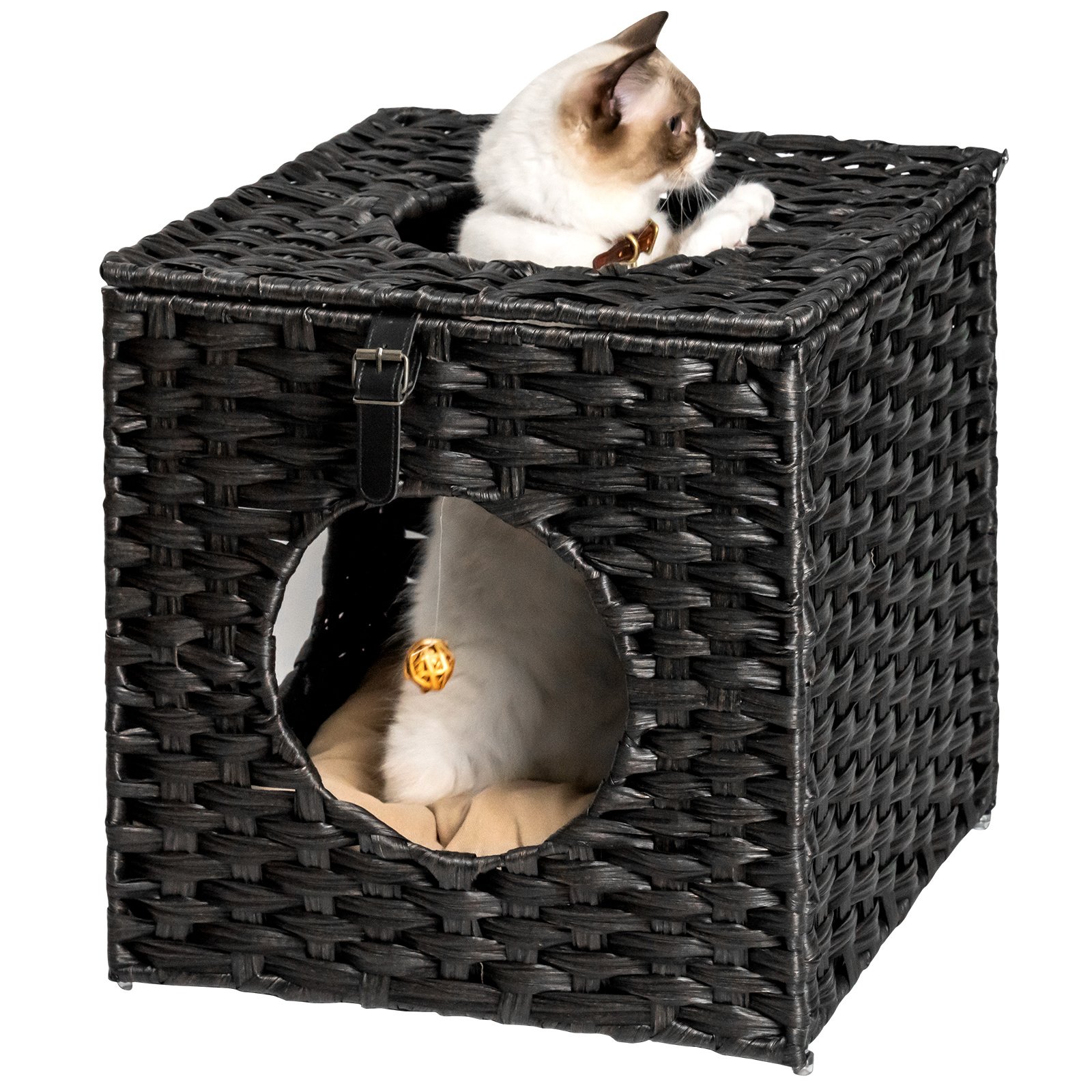 Rattan Cat Litter; Cat Bed with Rattan Ball and Cushion; Black