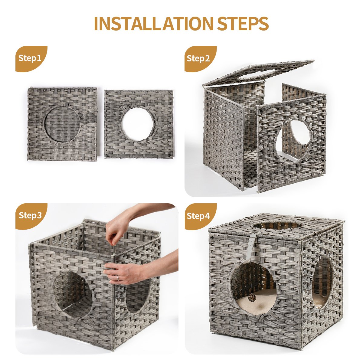 The package comes with illustrated instructions; this cat house can be assembled in a few simple steps; with a hex wrench; no need to bring your own tools; the top panel can be opened; with a belt; you can choose whether to fasten the top panel or directly open.3 holes; very suitable for cats to play without restraint.