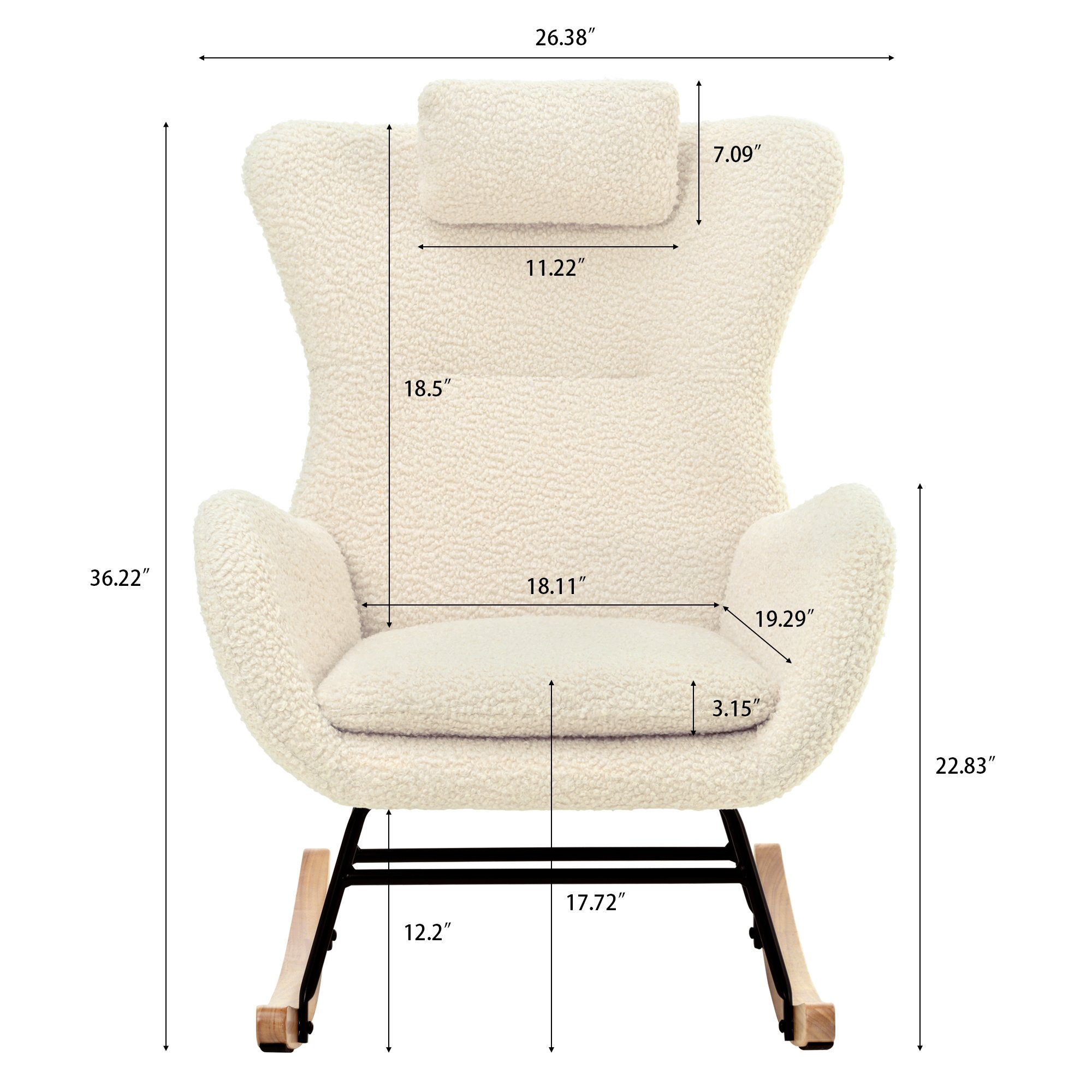 Weights & Dimensions & DescriptionProduct Type:Rocking ChairProduct size:26.38 "W* 34.25"D *36.22 "HSeat Length:18.11 "Seat Depth:19.29"Seat Hight:17.72"Height of Backrest:18.5"Internal Frame Material:Internal Iron Frame+Plywood+FoamInternal Seat Material:FoamInternal Backrest Material:FoamMaximum Load Bearing:220 LBSCarton Size:26.2"W*11.6"D*27.2"HN.W.:25.19LBSG.W.:28.27LBSMaterial:Teddy Fabric Cover+Foam+Iron Frame+Toy Cotton+Rubber Wood LegsAssembly Method:Seat/Back/Leg KD
