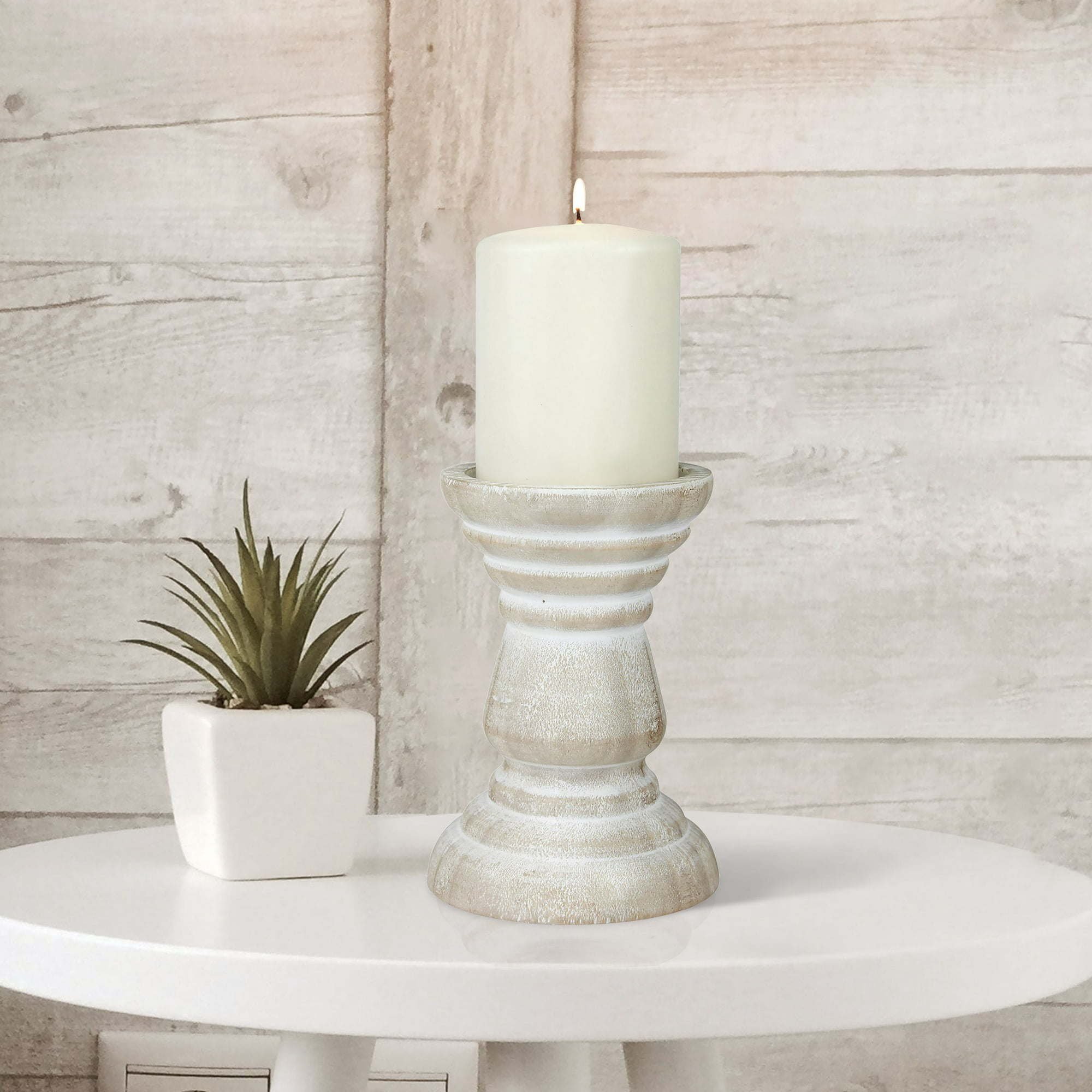 Display your favorite pillar candles in style with a Stonebriar tabletop 6" coastal wood pillar candle holder. This decorative candle holder is made of turned wood with a lightly distressed white wash painted finish. Each pillar candle holder measures 4.2 inches in diameter and 6 inches in height. Candle holder can easily fit any 3" diameter pillar candle. Candle holder is made for indoor use and can be displayed on the coffee table, dining table, mantel, shelf, or any table top. Candle holder is available in 3 sizes (sold separately). Buy 1 size or buy all 3 to create a decorative set for wedding centerpieces, party decorations, or restaurant settings.