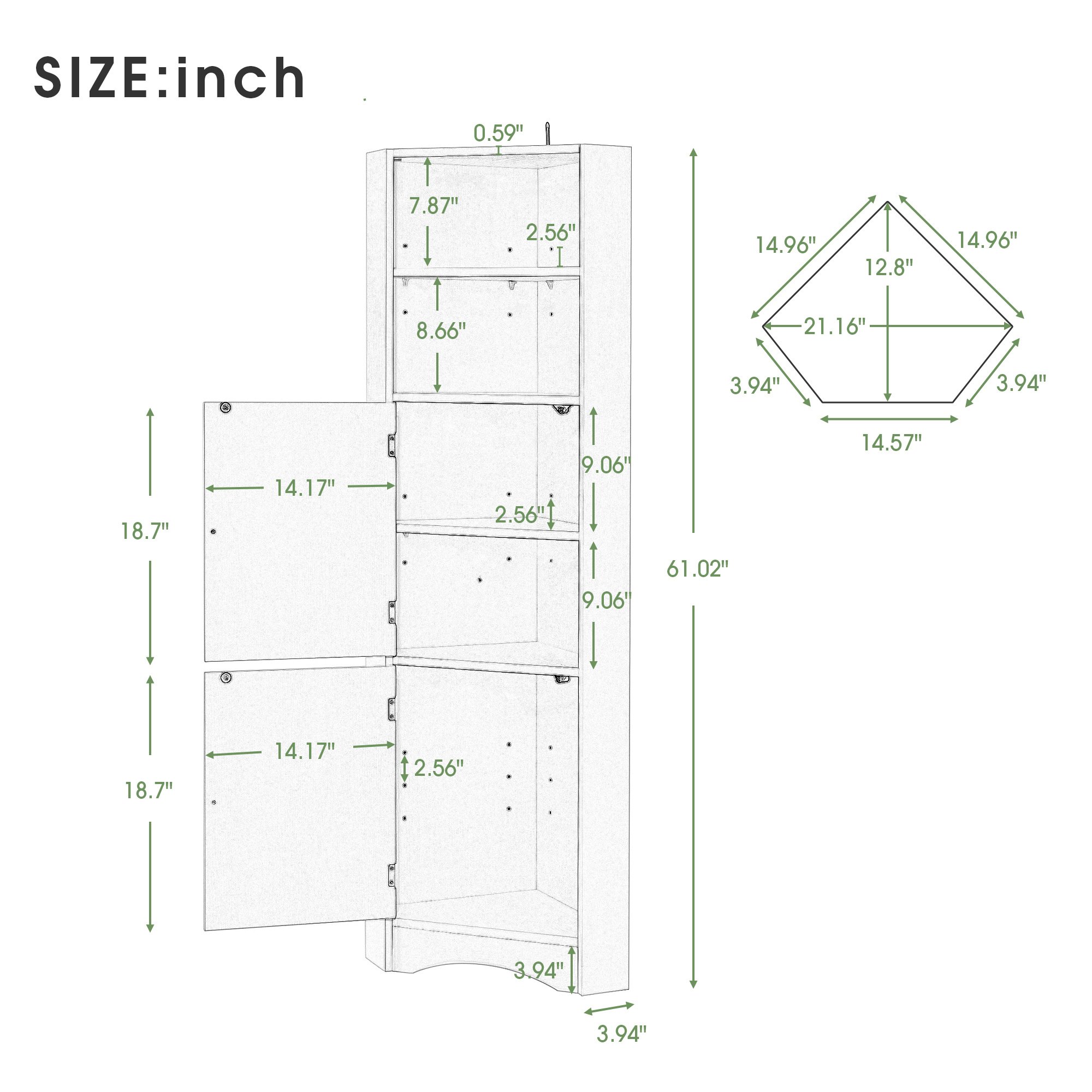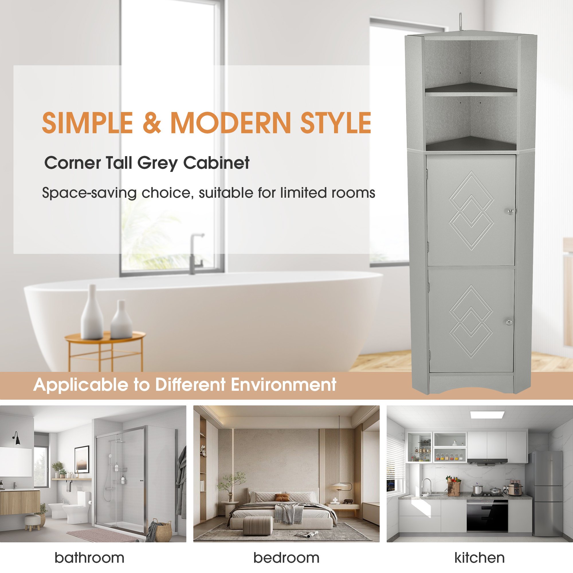 [Stylish and Considerate Details]: The bathroom cabinet is designed as a triangle shape to stand in the corner to save more space in your home. Furthermore, the rhombus pattern on the door and curved line in the base add more elegant elements to this cabinet. Metal round door handles and magnet door button comfort users when open and close the door.