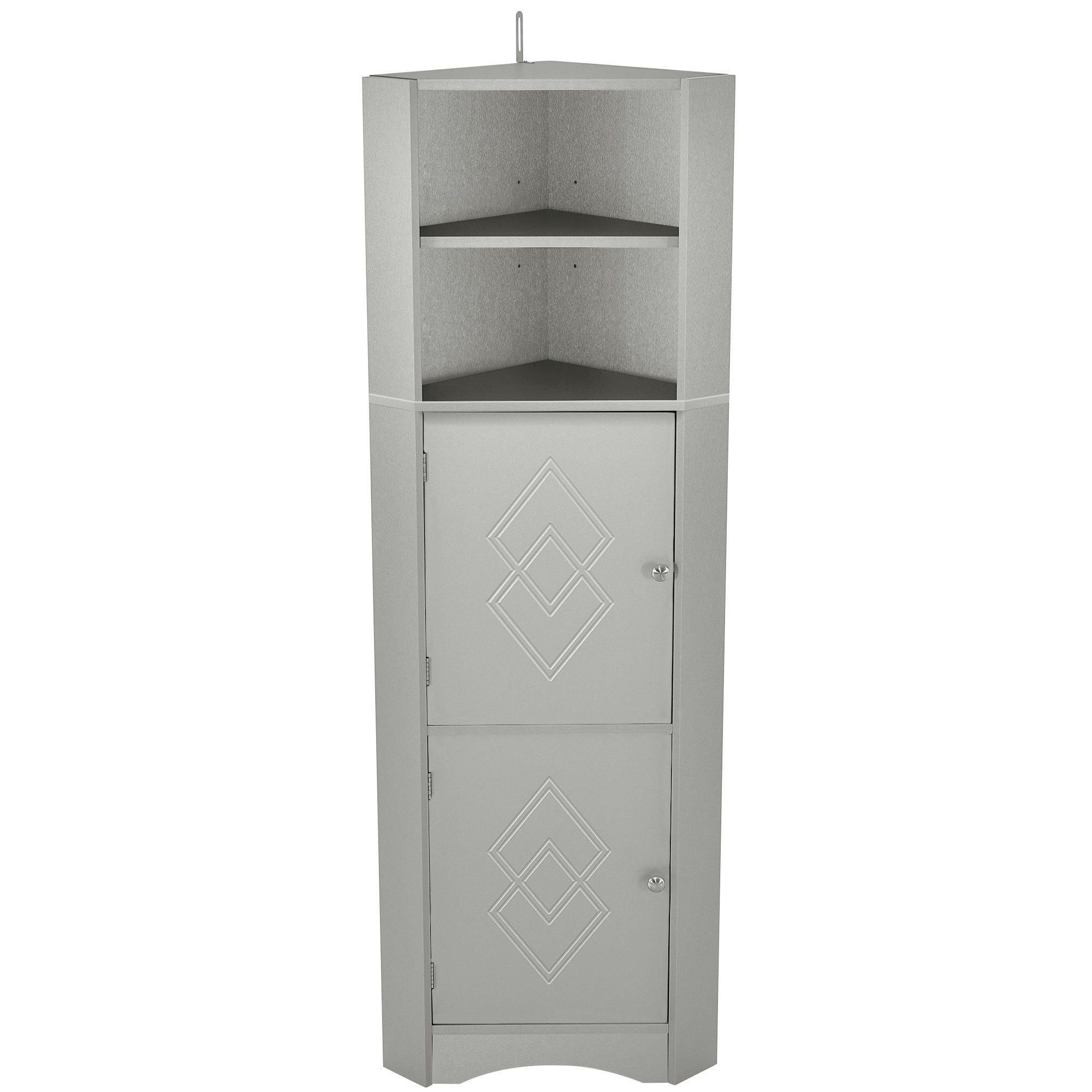 More InformationColorGrayMaterialMDF boardShapeTriangleCapacity20lbs each shelfAdjustable ShelfYesNumber of Drawers0Number of Doors2Anti-dumping DeviceYesPackage IncludeCabinet, hardware, instructionCountry of OriginChinaCertificateCARB P2