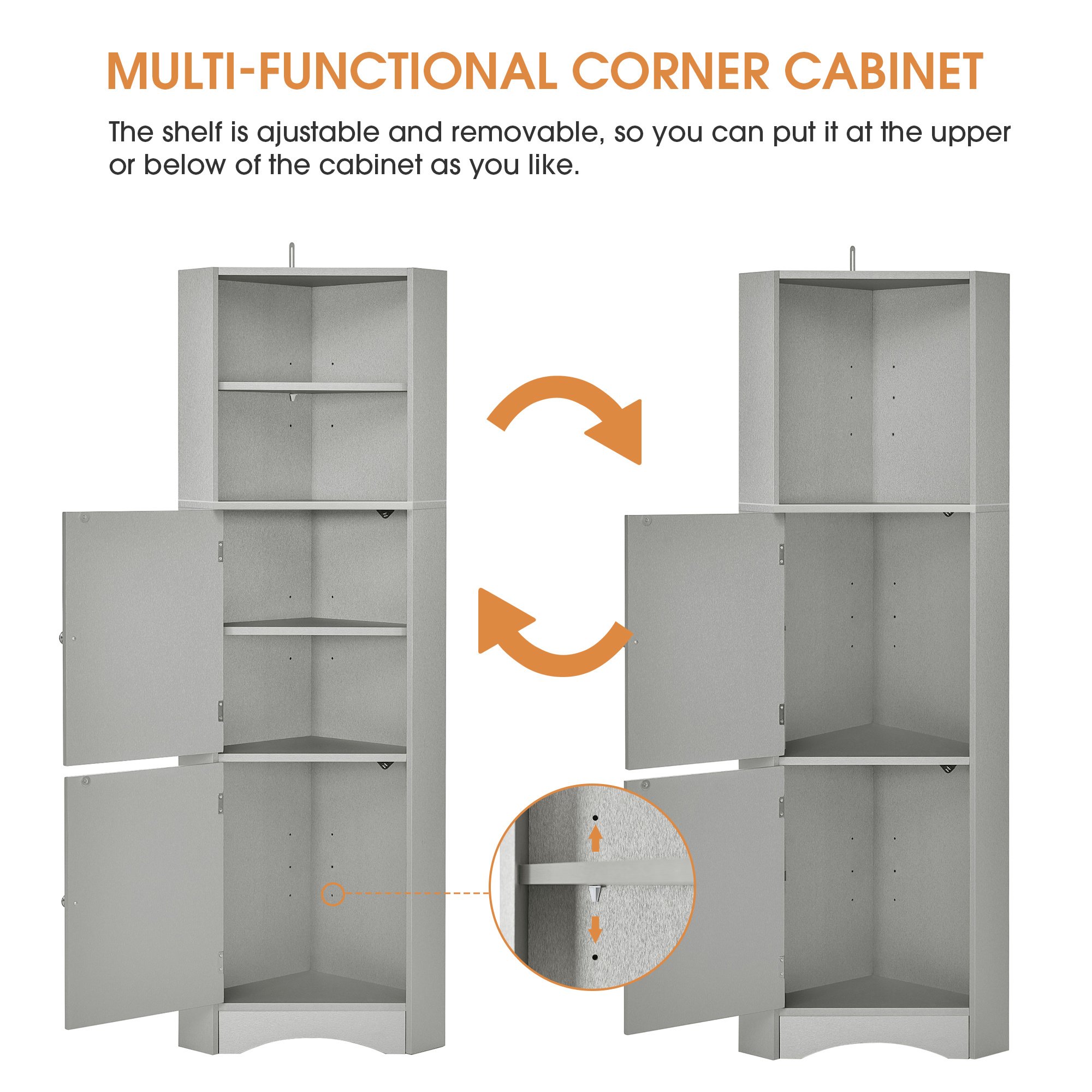 [Adjustable Shelves]: This corner cabinet contains two movable shelves that allows you to install it in the up, middle or down part of the cabinet to divide the storage space. What's more, each shelf can be adjusted to different heights according to the pre-drilled holes. It totally satisfies home storage needs.