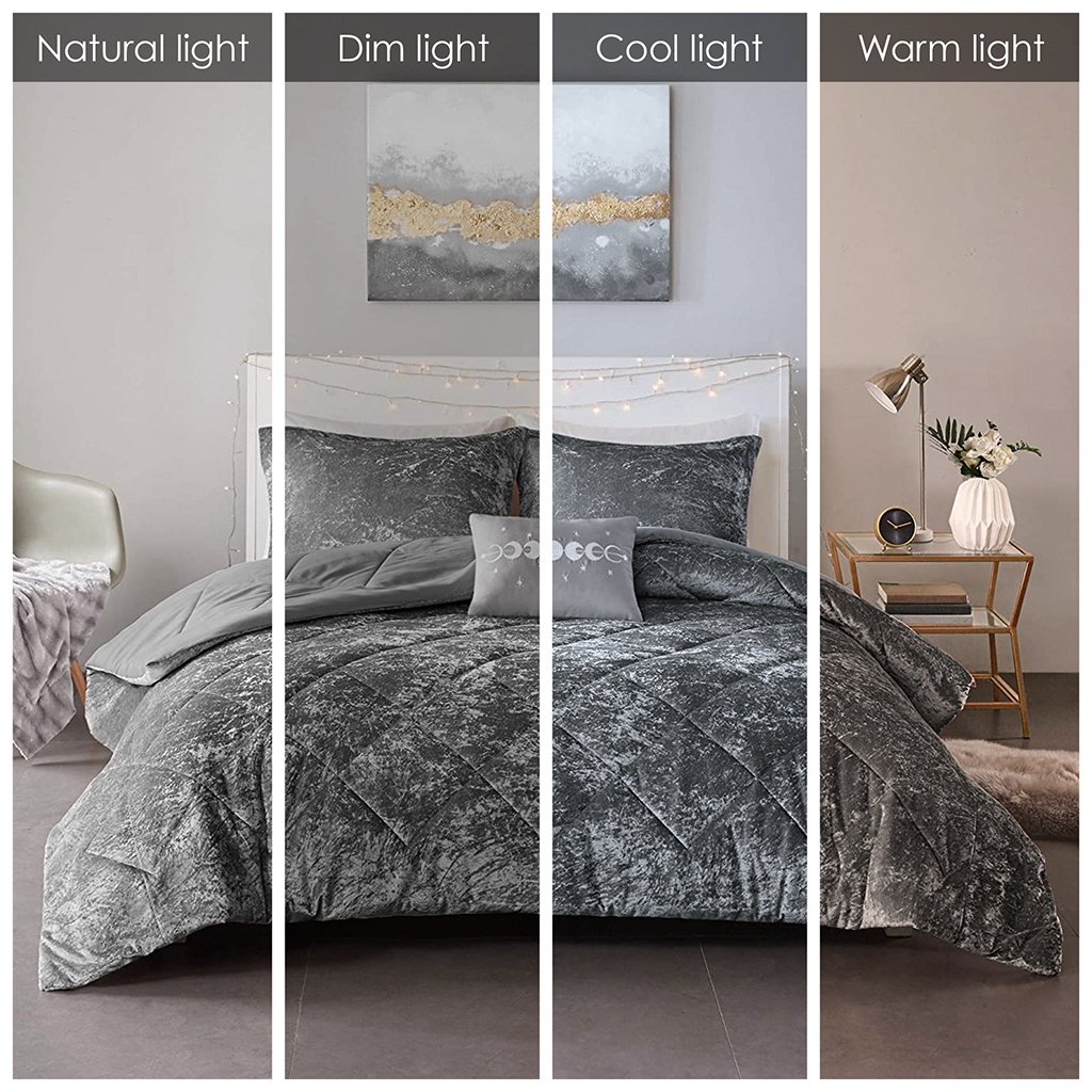 DescriptionCreate a lush and relaxing atmosphere in your bedroom with the Intelligent Design Felicia Velvet Comforter Set. The grey comforter is made from crushed velvet and features diamond quilting for a luxurious look. Matching crushed velvet sham(s) and an oblong decorative pillow complement the comforter to complete the modern style bedding set. Machine washable for easy care, this velvet comforter set uses hypoallergenic filling in the comforter and decorative pillow for extra softness and comfort. Feel the warmth and lustrous beauty of this velvet comforter set when you incorporate it into your bedroom décor. Items in the set may come in a rolled or compressed packaging, which will need to be fluffed up or steam ironed before use to remove wrinkles.Product DetailsTwin/Twin XL1 Comforter:68"W x 90"L1 Standard Sham:20"W x 26"L + 2"D1 Decorative Pillow:12"W x 16"LMaterialComforter/sham:100% polyester crushed velvet fabric quilting on face, 100% polyester microfiber reverse;Pillow: 100% polyester cover with embroidery on face, poly fill