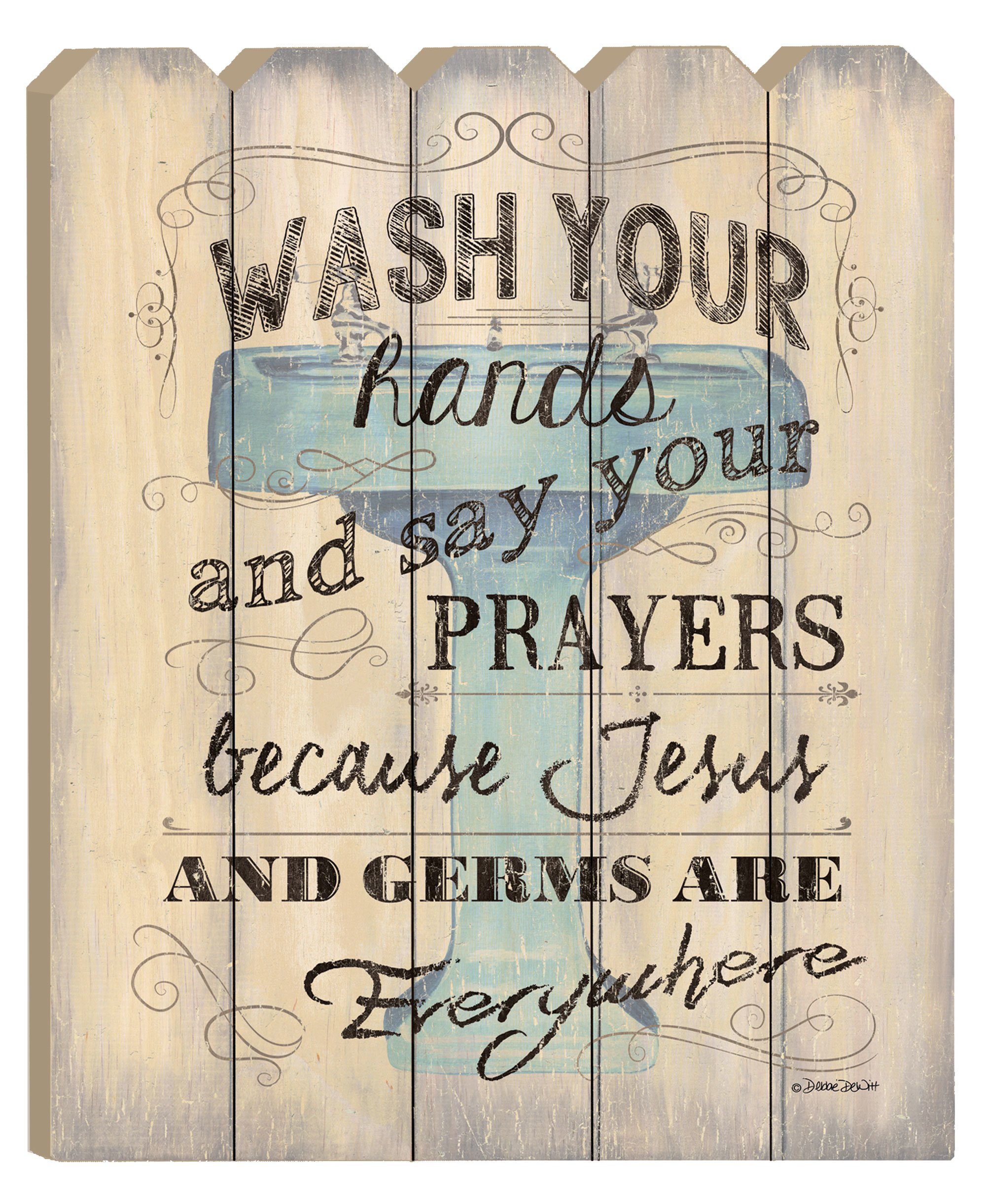 Wash Your Hands is by artisan Debbie Dewitt. This beautiful wall art printed on wooden picket fence is 16x20. This print features a vintage teal sink with the script overlaying the whole print in a very cursive style font. The script says "Wash Your hands and say your prayers because Jesus and germs are everywhere. This wall art features a unique sawtooth hanger which arrives ready to hang making it perfect for any location. This wall art is 100% American made by skilled workers.•Print has fade resistant surface texture, no glass is necessary•Woman Owned Business (WBE)•Arrives ready to hang, no additional hardware needed on item•IndIvIdually hand crafted by skilled AmerIcan workers•Art Printed on a Pickett Fence•Clean with Soft Dry Cloth Only (Made in U.S.A.)