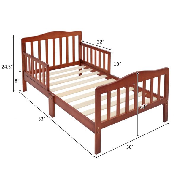 Introductions:The Wooden Baby Toddler Bed Children Bedroom Furniture with Safety Guardrails is the perfect choice for transition from crib to big-kid bed, definitely a must-have for any growing child. It features an simplistic, elegant design that brings a classic look to any bedroom. Guardrails on either side of the bed provide added security to guarantee that your little one will be safe throughout the night. The bed is 8 inches from floor, making climbing in and out of bed safe and convenient for little kids. Made from strong and sturdy wood, this toddler bed is stable and durable so you can rest assured to count on it.