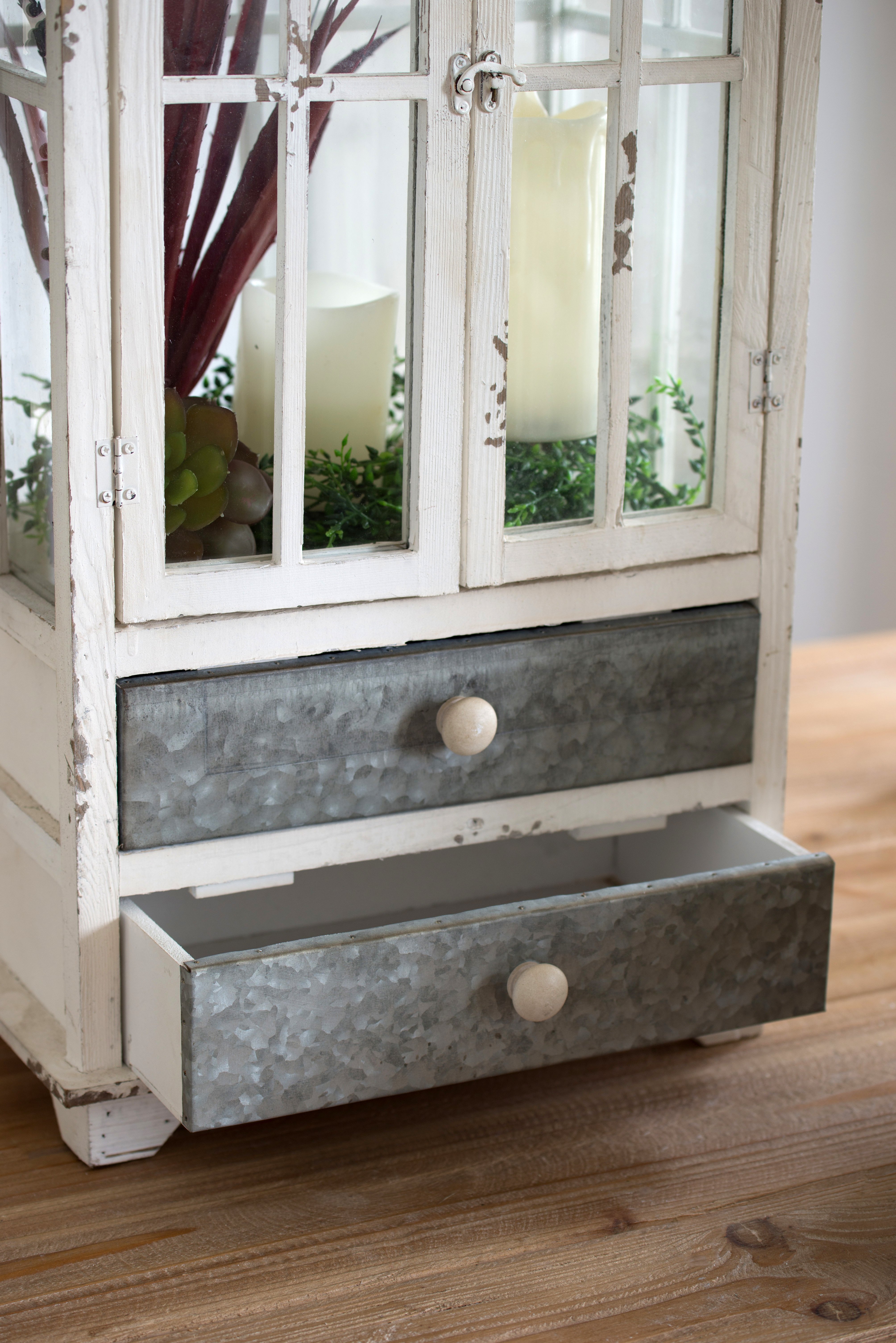 The DesignThe Evelyn Enclosed Lantern Set features a larger piece In distressed white and galvanized metal that features two lower drawers for tucking away trinkets such as matches or additional tealights. It is accompanied by a smaller, matching Lantern with no drawers. Both have handles for hanging or carrying.